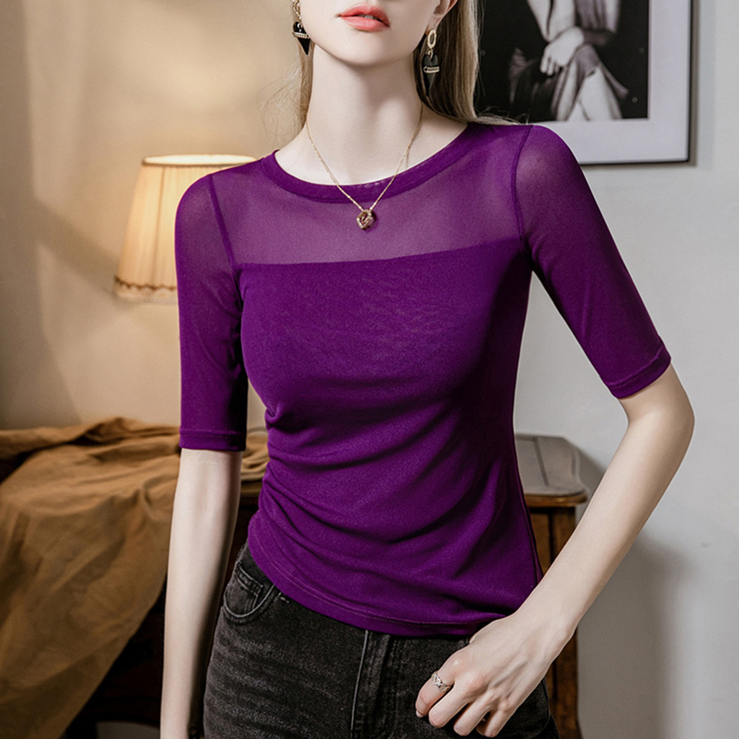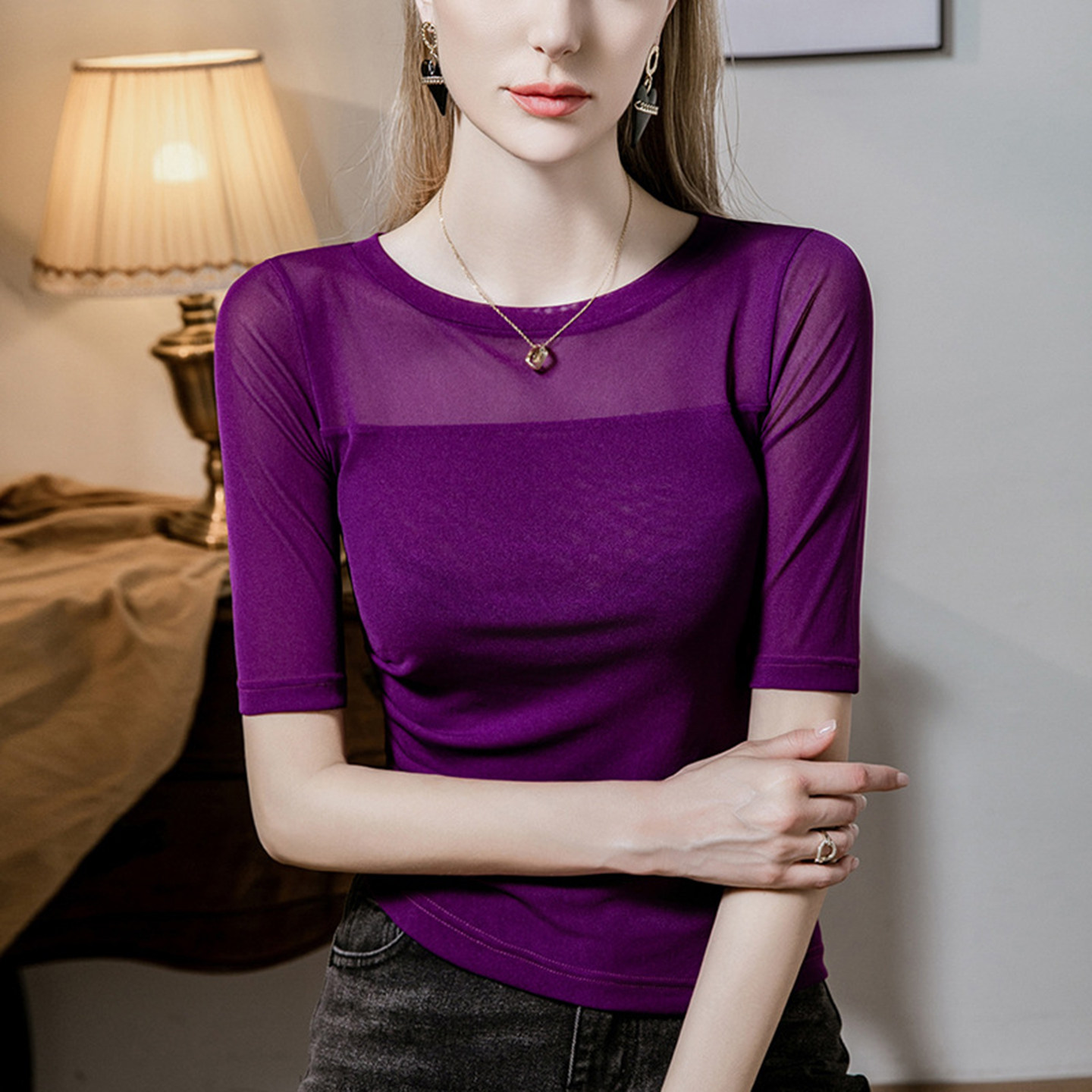 不规则下摆网纱打底衫女中袖秋装
