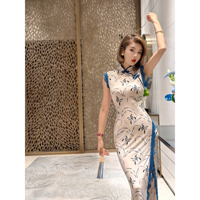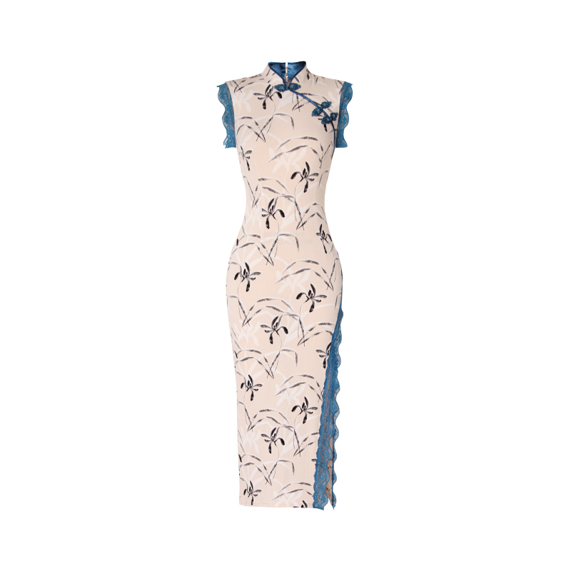 XULU原创水晶麻纱拼蕾丝花边气质显身材高腰斜襟盘扣无袖立领旗袍