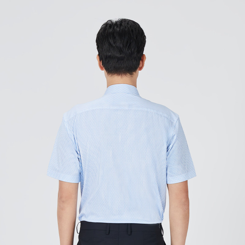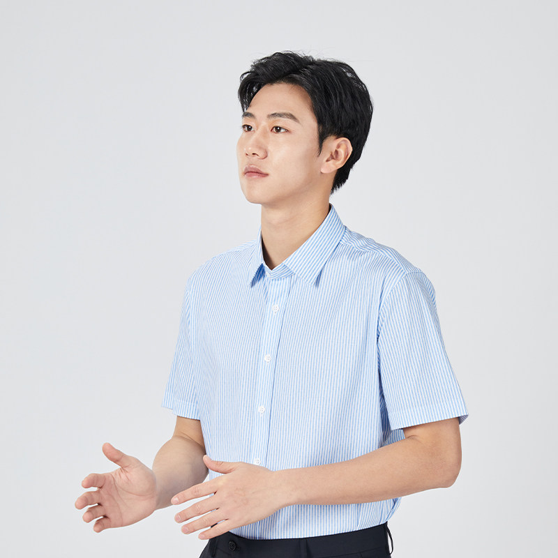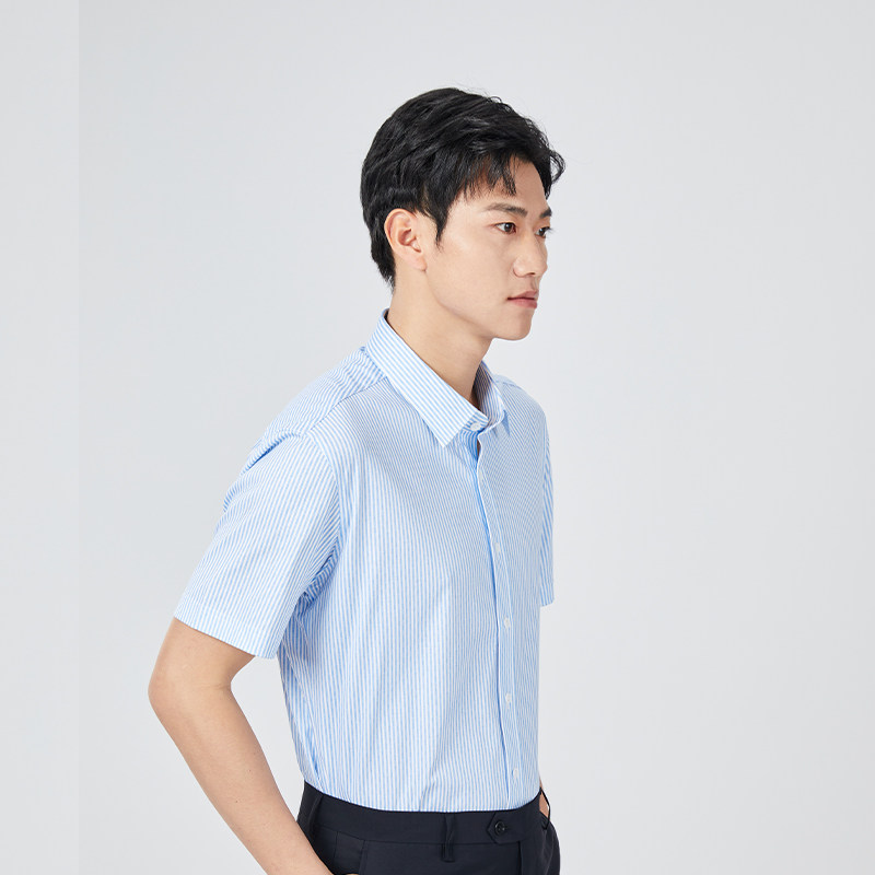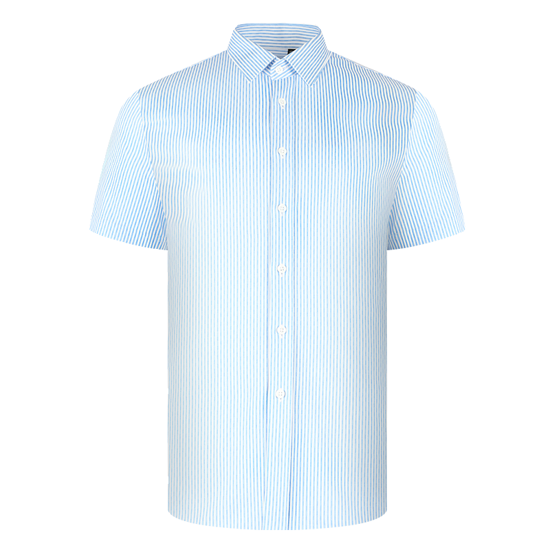 【针织】乔治白春夏男士短袖衬衫尖领纯棉蓝条纹衬衣直筒微弹上衣