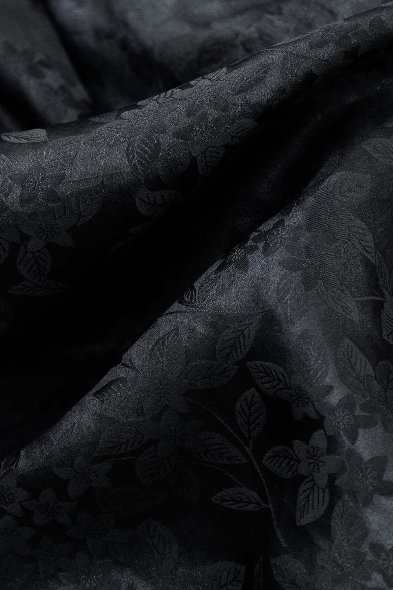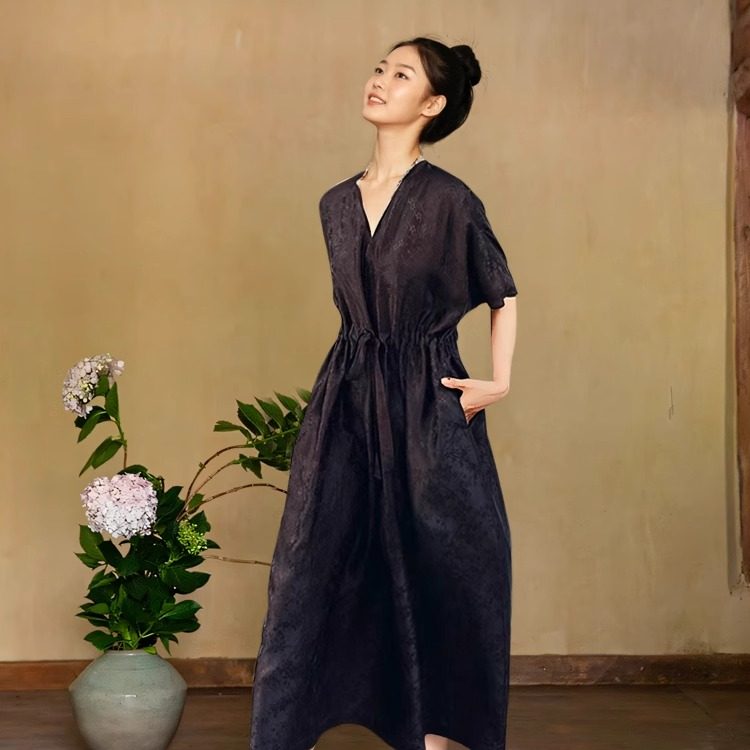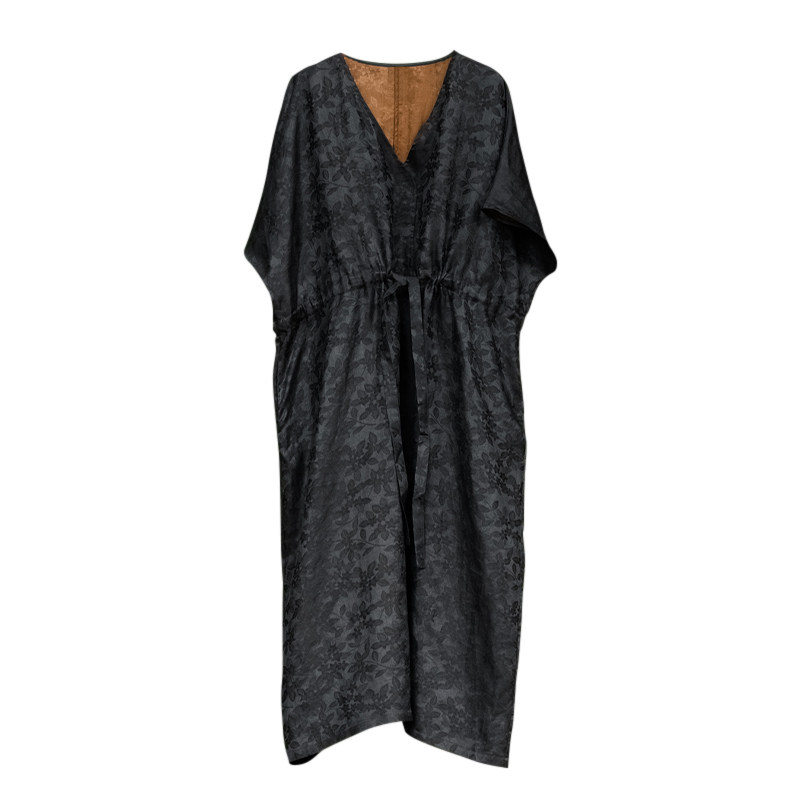黑色花萝香云纱V领宽松袍子 知笔墨2025年夏季高端太太服长裙子