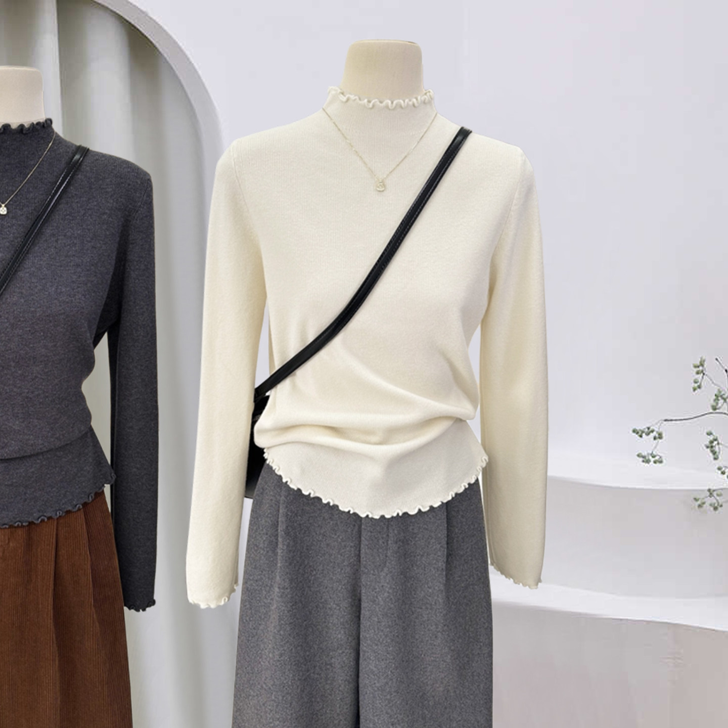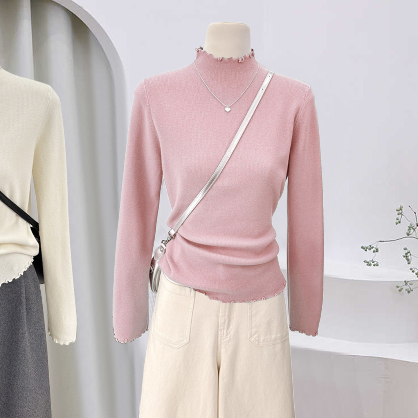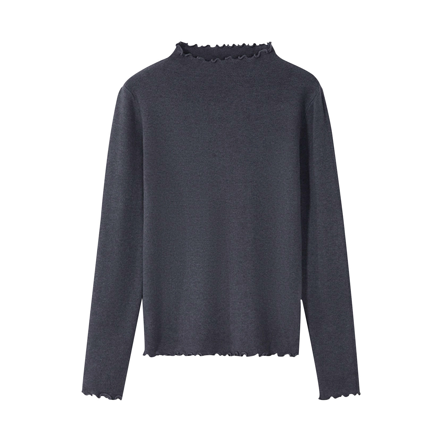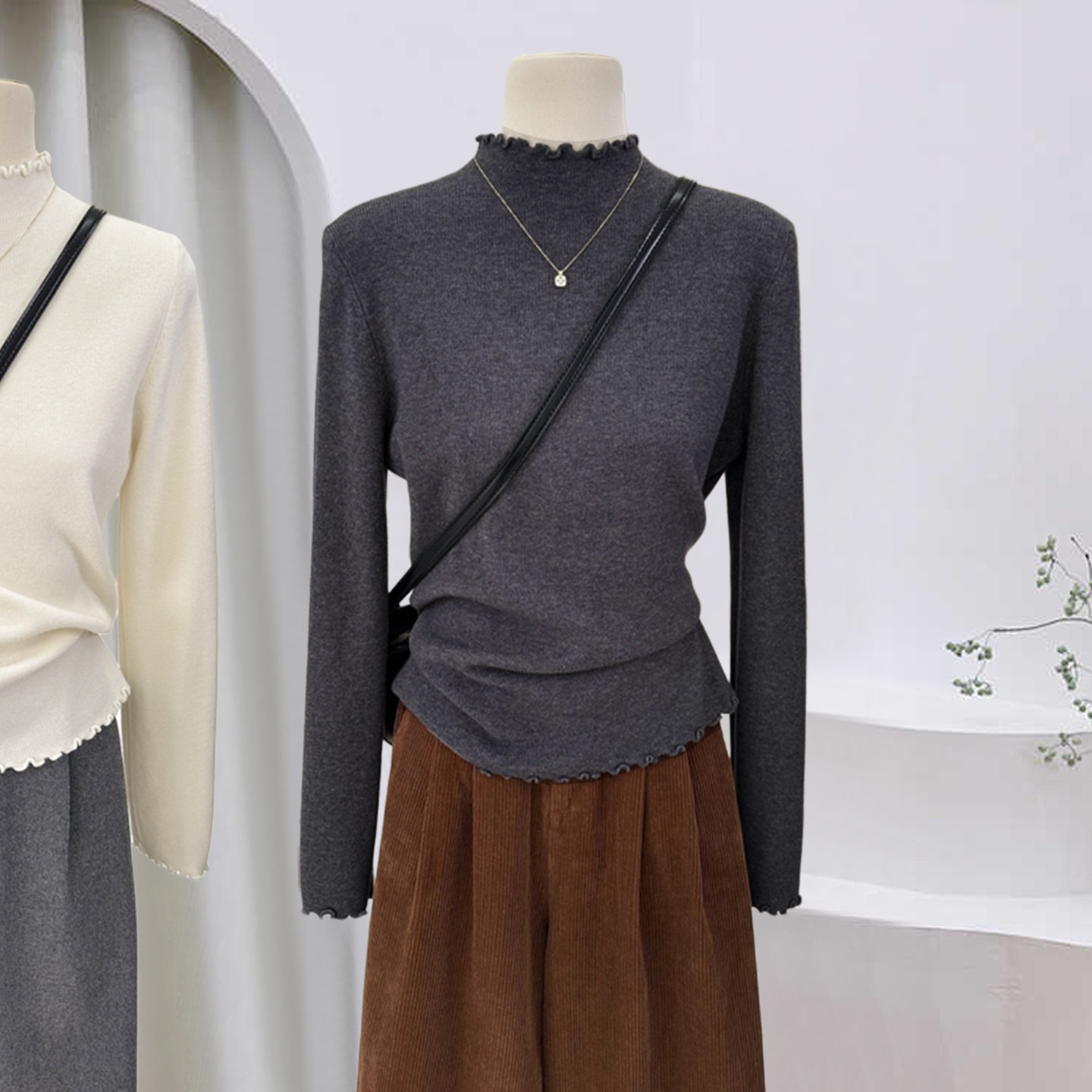 灰色高级感半高领针织打底衫女2025年秋冬新款木耳边毛衣内搭上衣