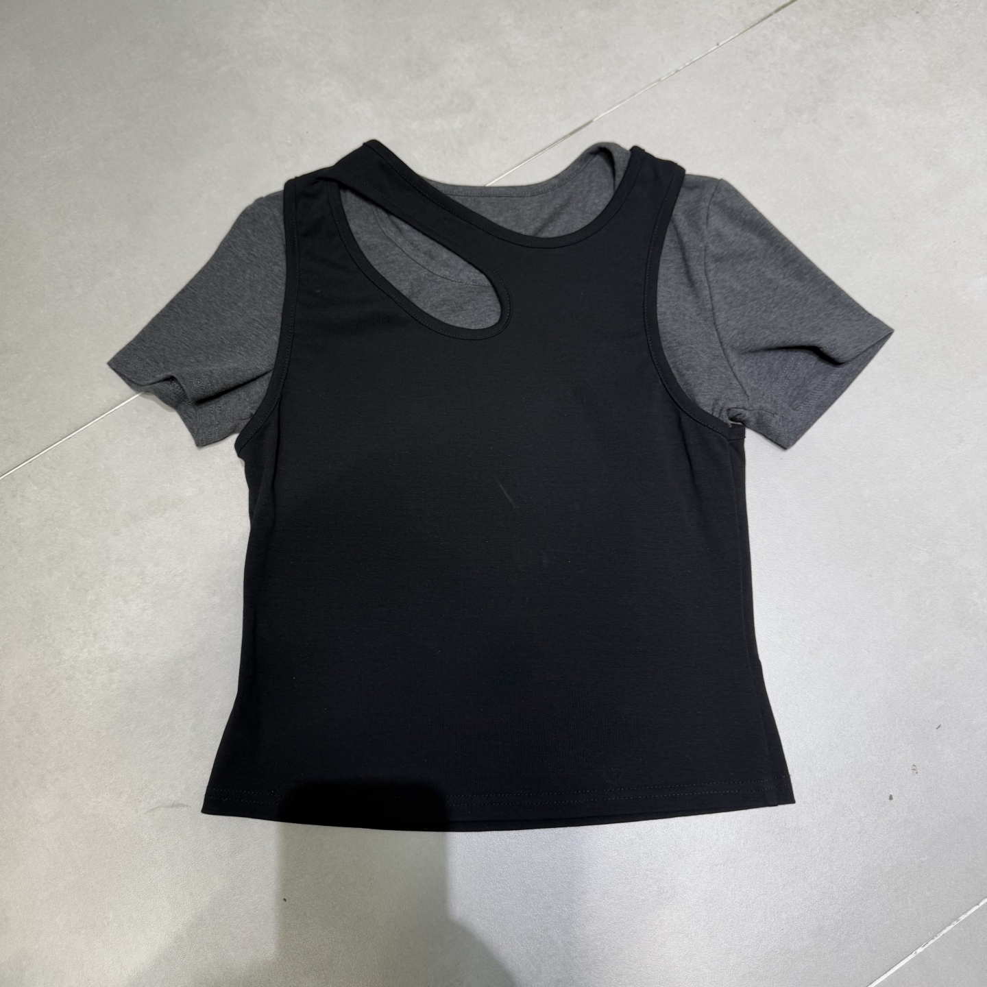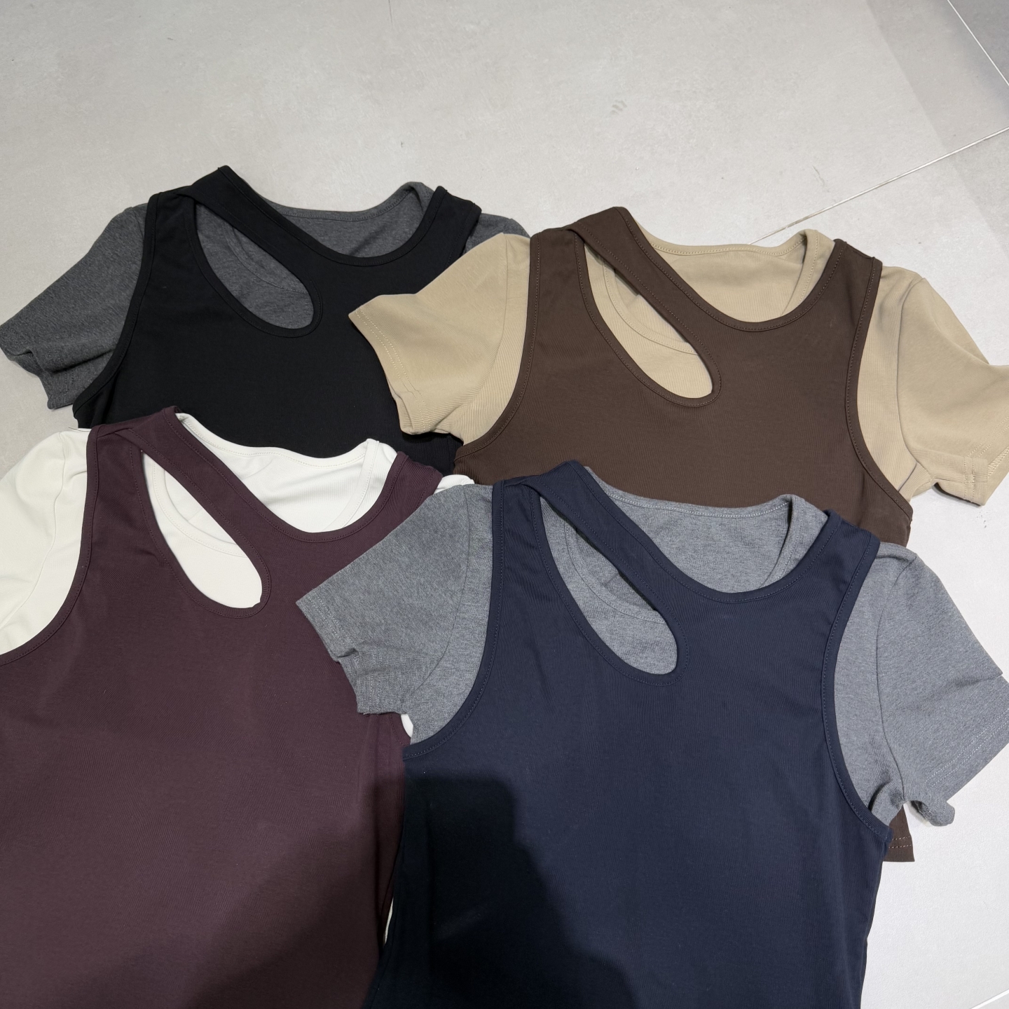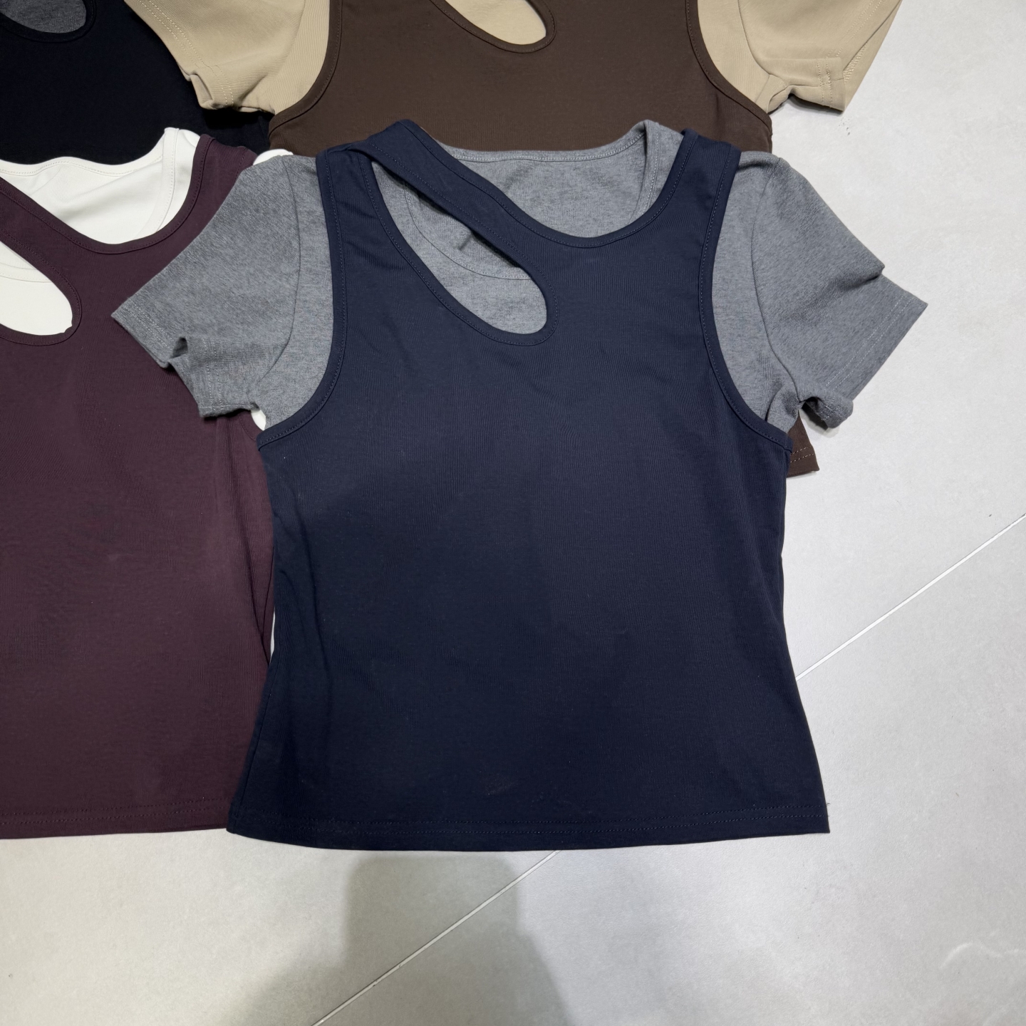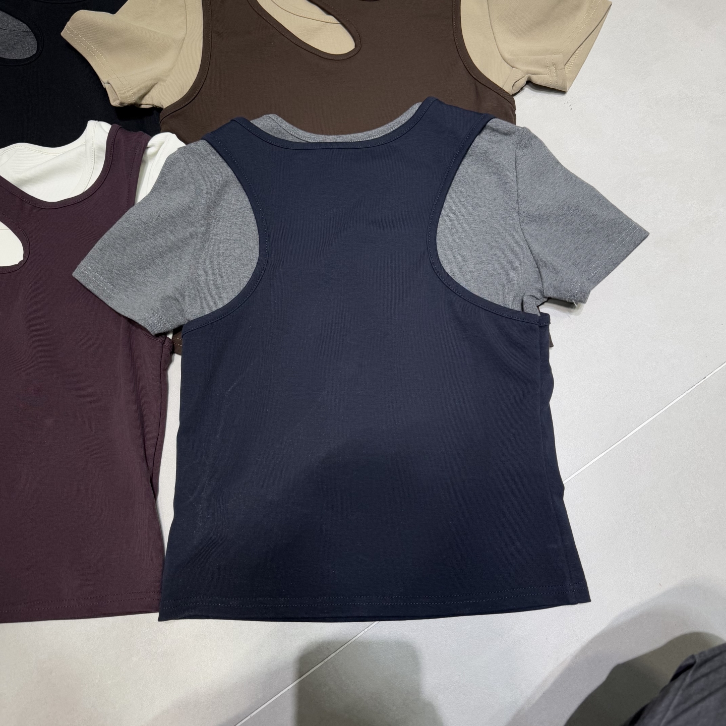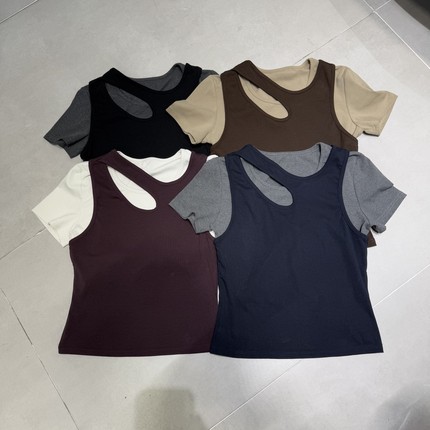 欧洲站2025秋季新款设计感撞色拼接假两件短袖T恤女小心机打底衫