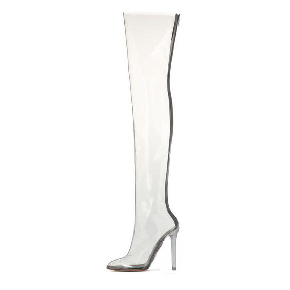 欧美外贸尖头透明过膝长靴48大码高跟中筒靴后拉链走秀时装女短靴