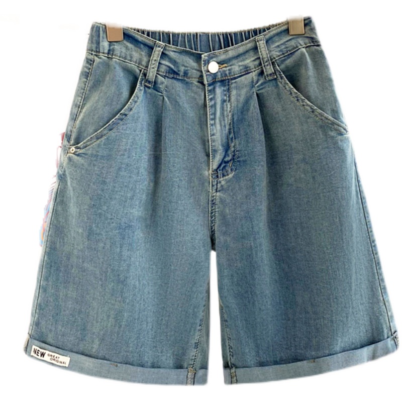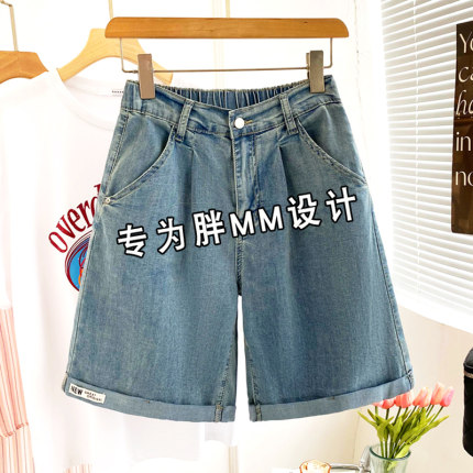 夏大码牛仔短裤女胖MM宽松弹力高腰显瘦学生胯宽大腿粗直筒阔腿裤