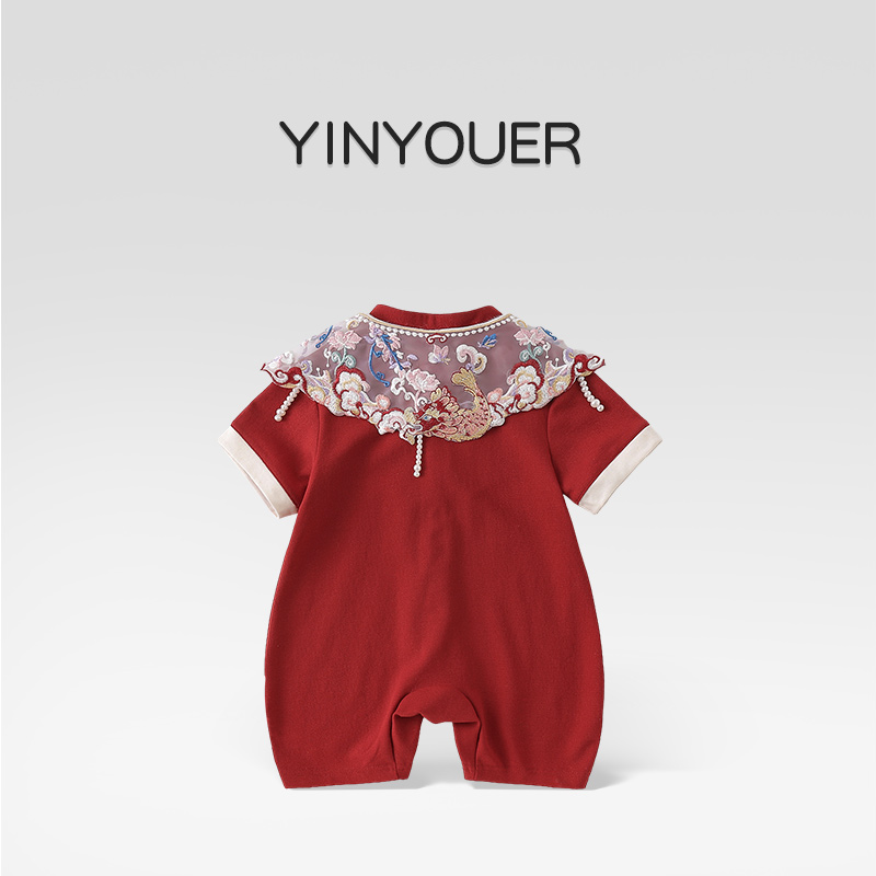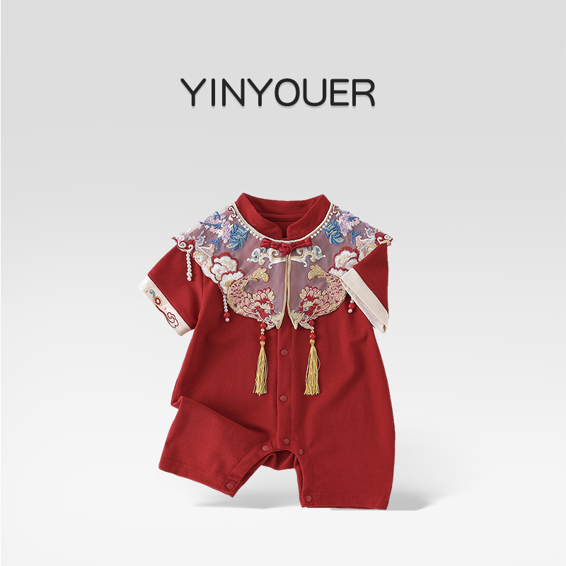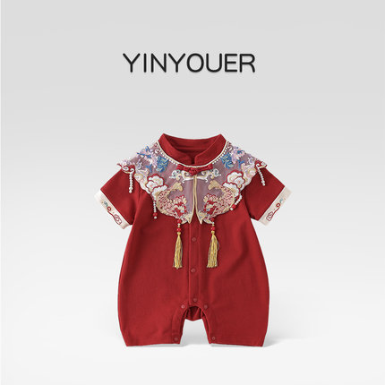 夏季百天婴儿短袖红色中式连体衣