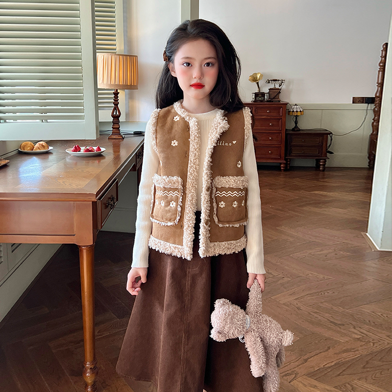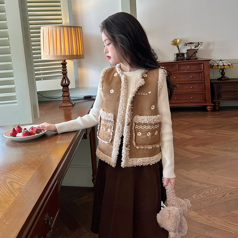 栀了成长记童装女童鹿皮绒皮毛一体马甲冬装儿童宝宝绣花背心外穿