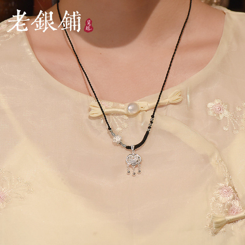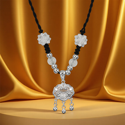 吴越老银铺足银999莲花平安锁复古中式镂空长命锁吊坠项链礼物