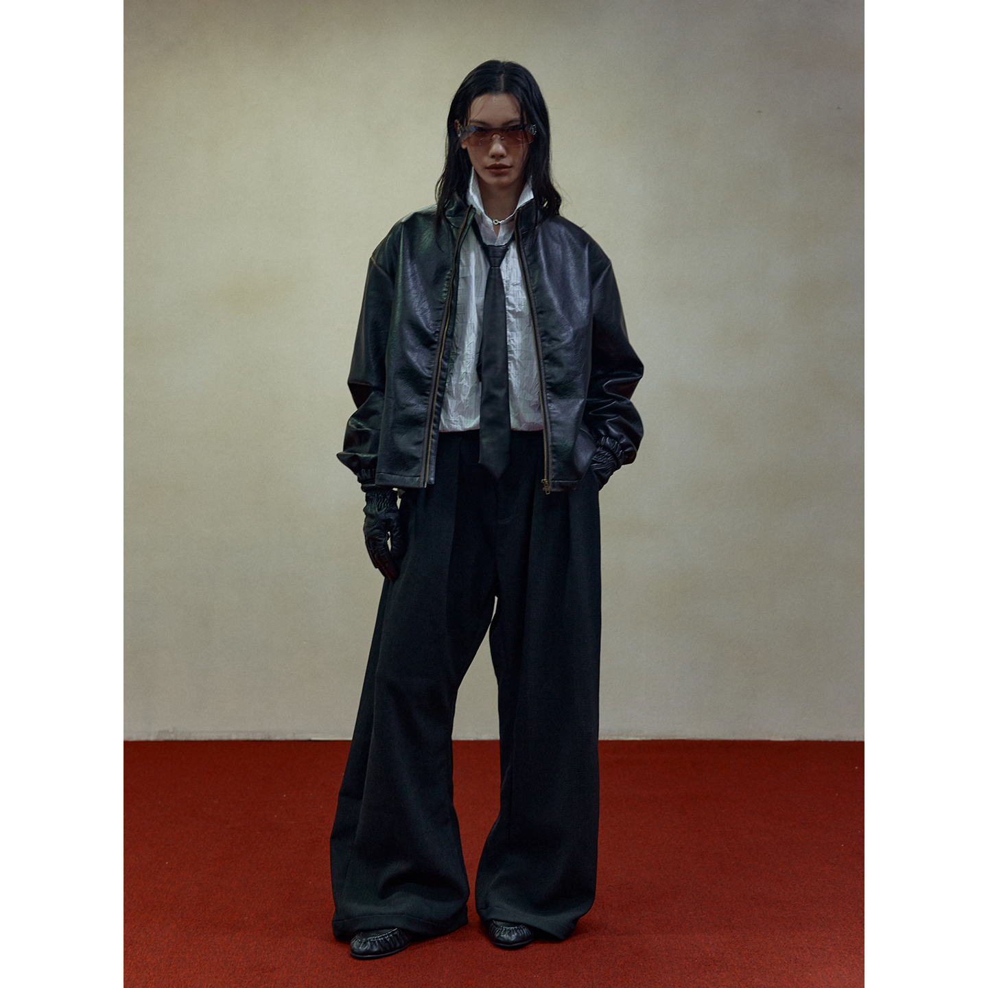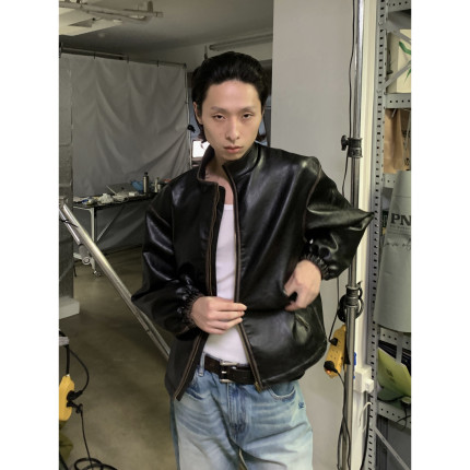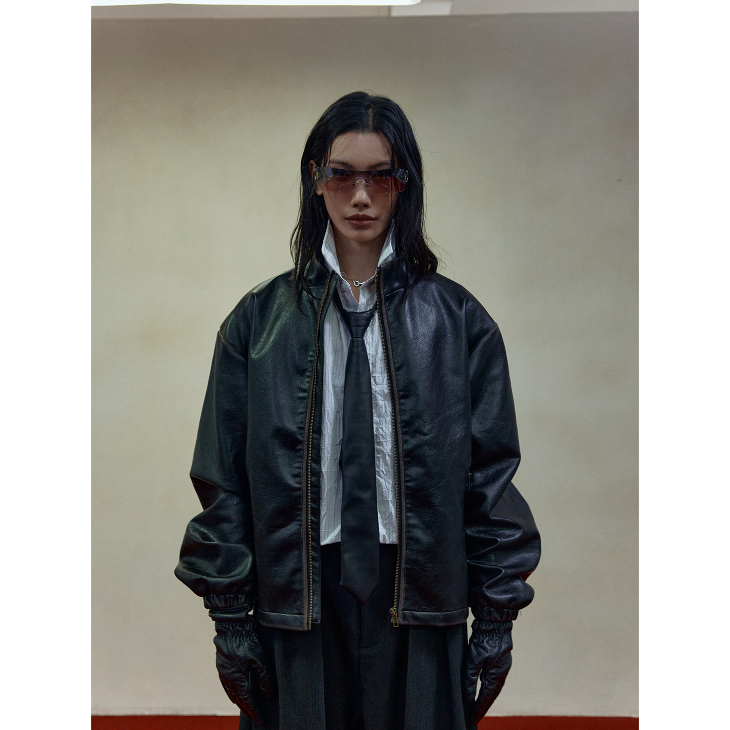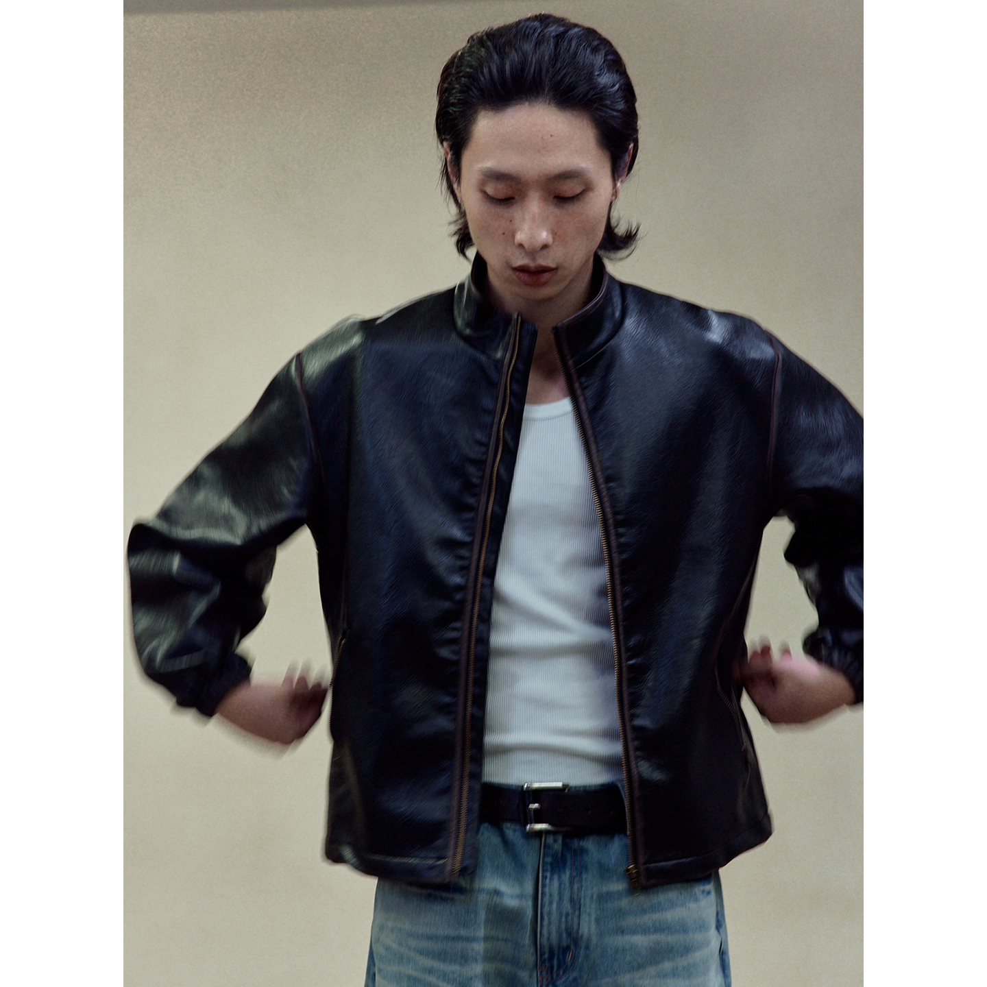 INKNOTS美式复古做旧立领boxy皮衣夹克男女cleanfit宽松休闲外套