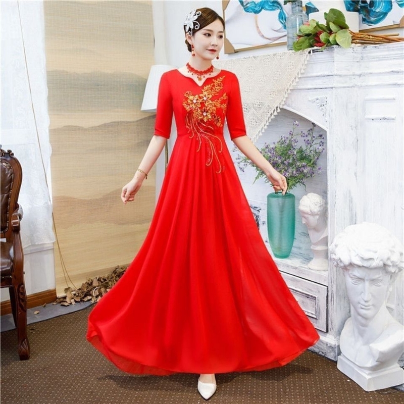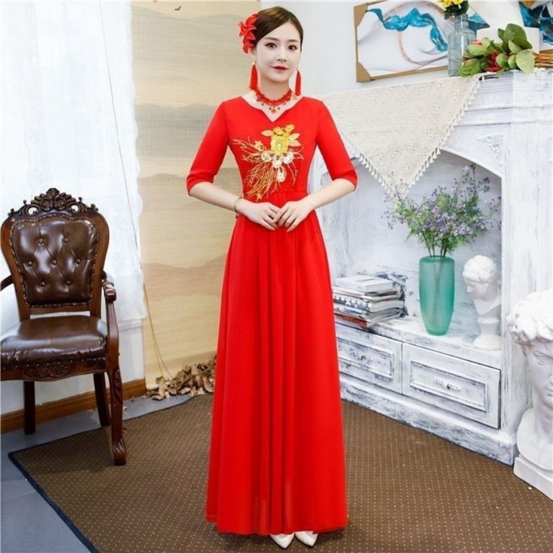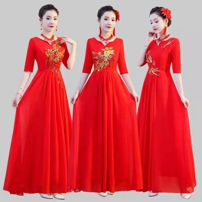 2022新款礼服大合唱服女长裙成人中老年大红诗歌朗诵表演演出服