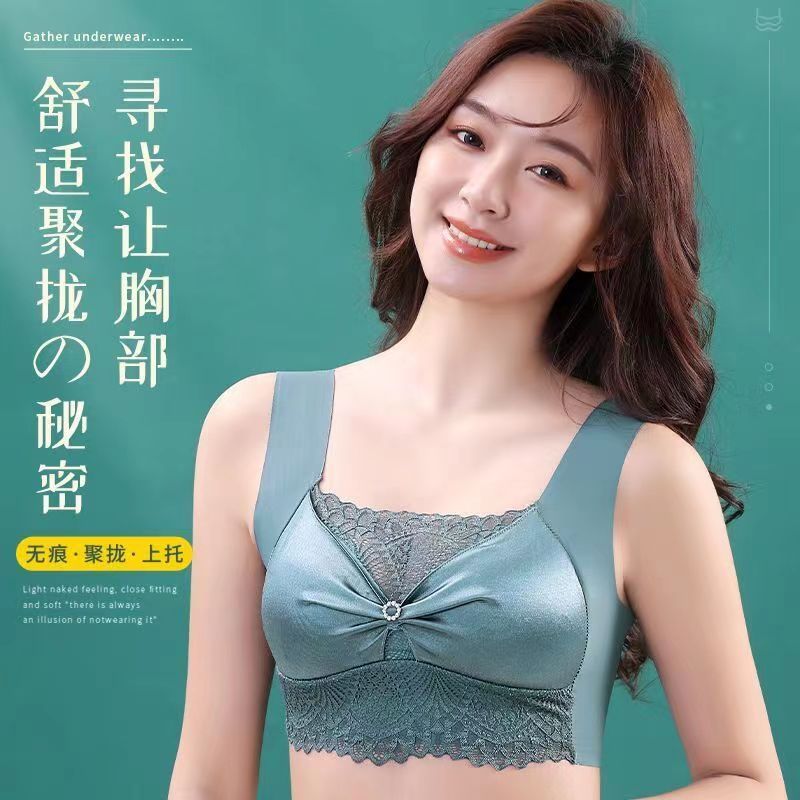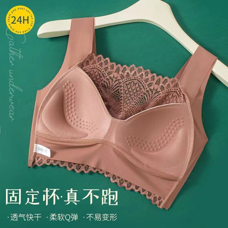 蕾丝固定杯内衣女聚拢夏季无痕无钢圈冰丝美背一体文胸中老年大码