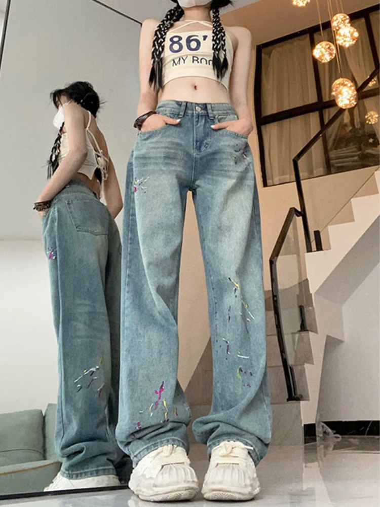 大码女装刺绣直筒牛仔裤胖妹妹mm粗腿大胯宽显瘦遮肉高腰阔腿裤潮