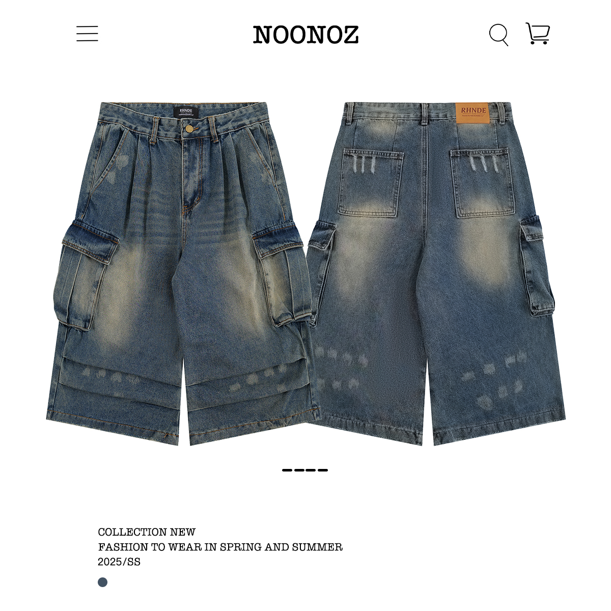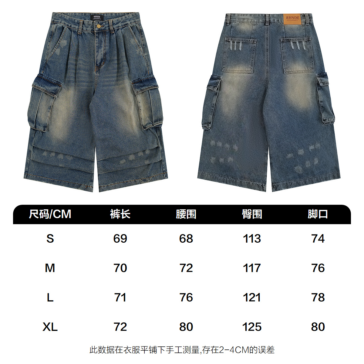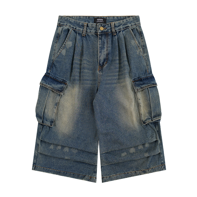 NOONOZ牛仔七分裤男美式复古做旧立体口袋褶皱宽松垂感阔腿短裤