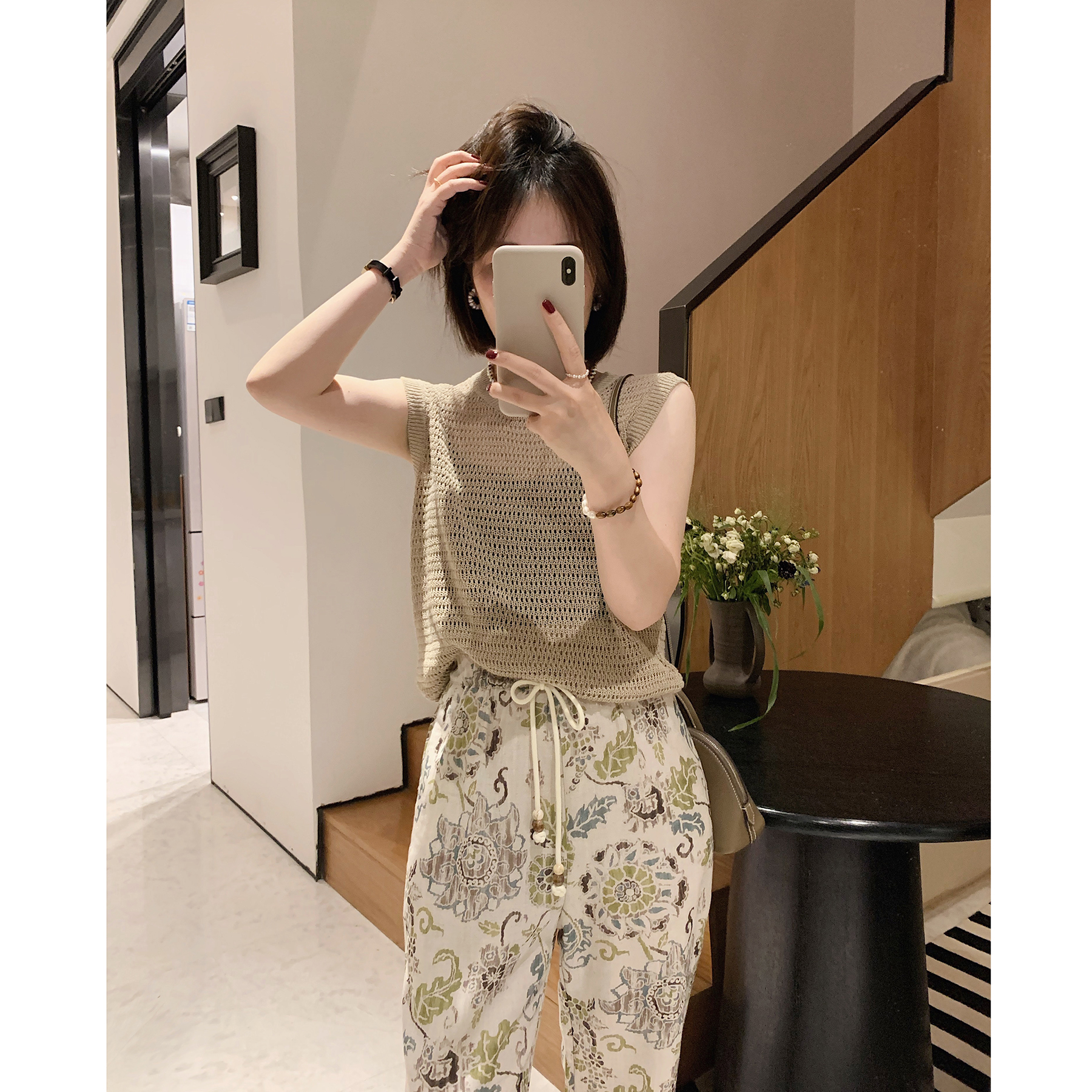 misslady洋气复古镂空冰丝背心无袖套头圆领透气针织上衣女夏季