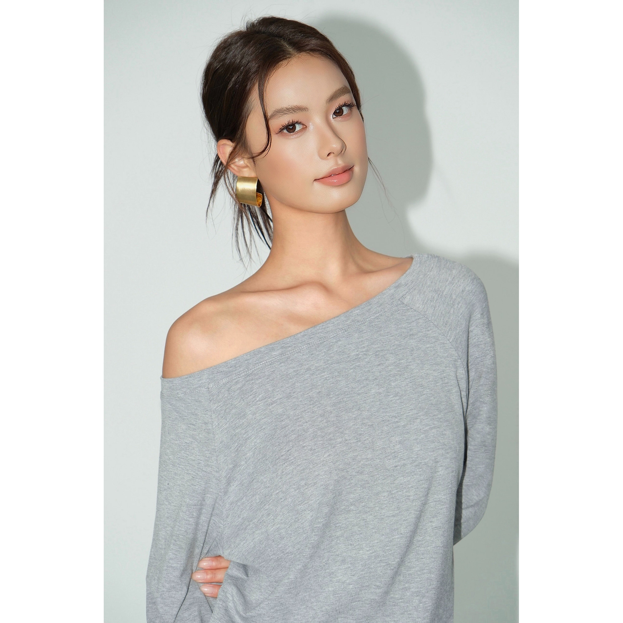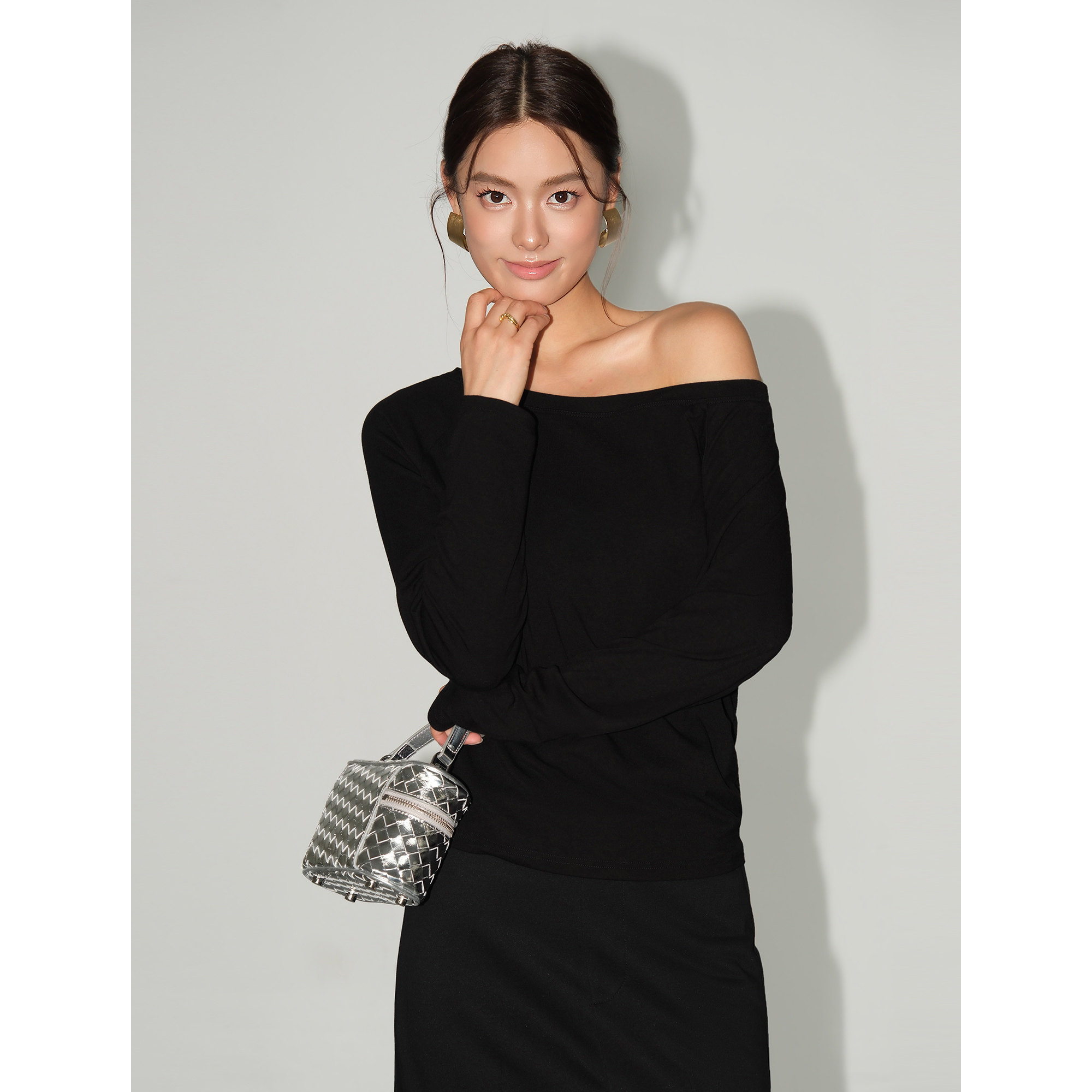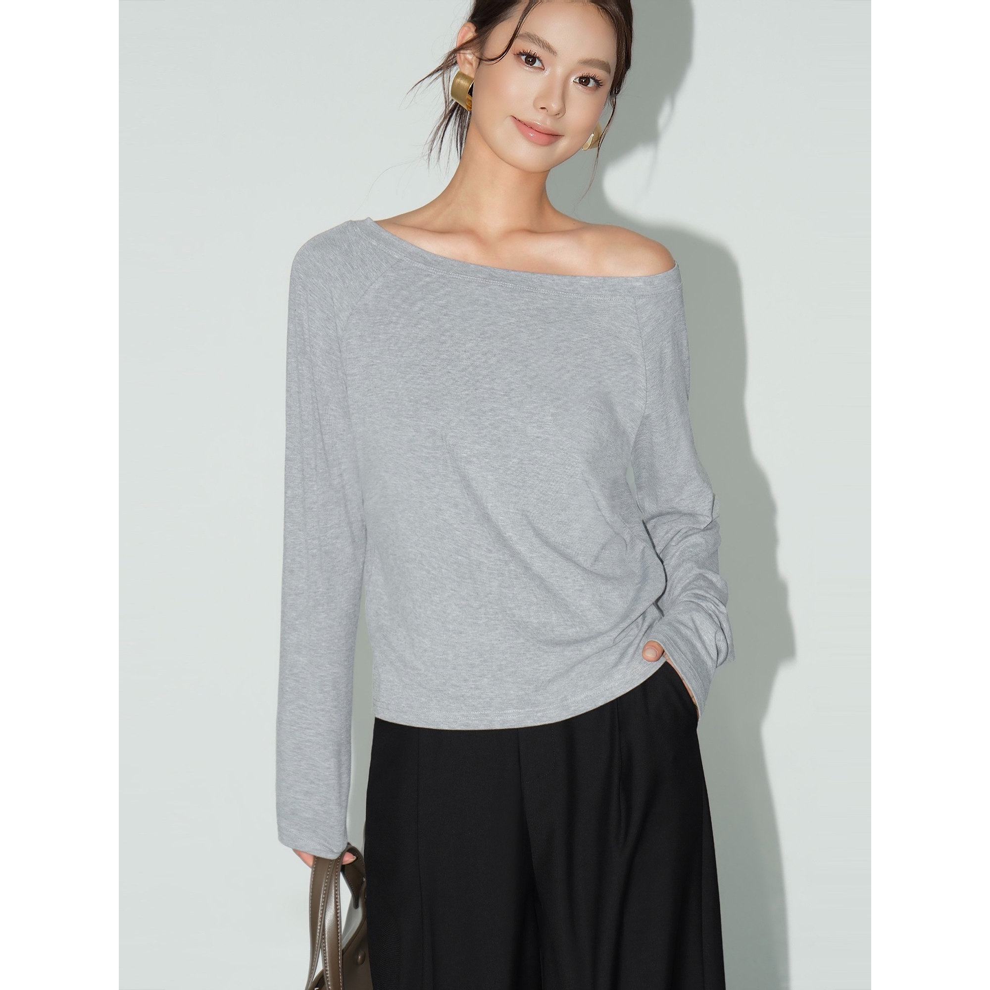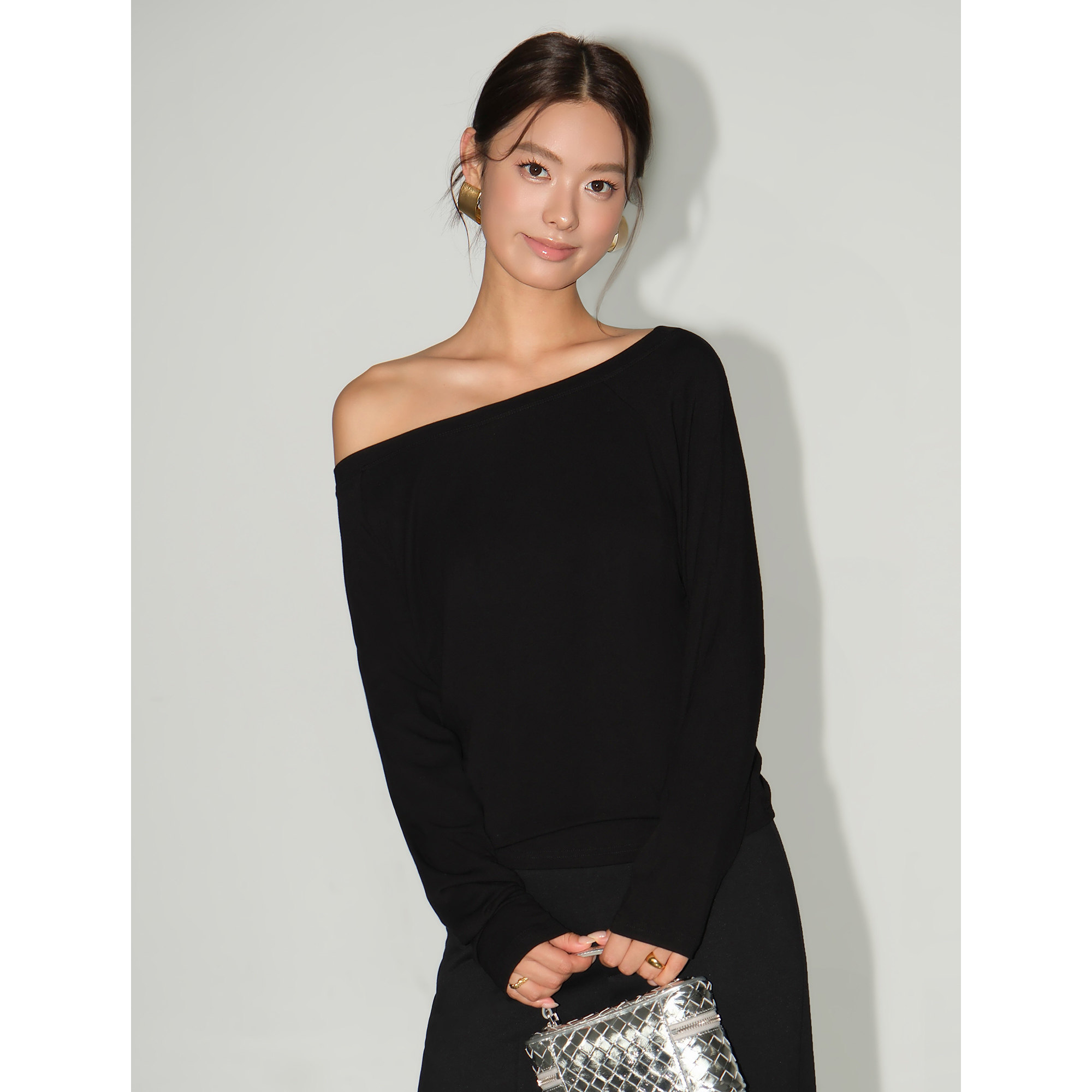 NEVA HU 雾漫仟霜 黑色斜肩宽松长袖T恤女休闲慵懒风气质露肩上衣