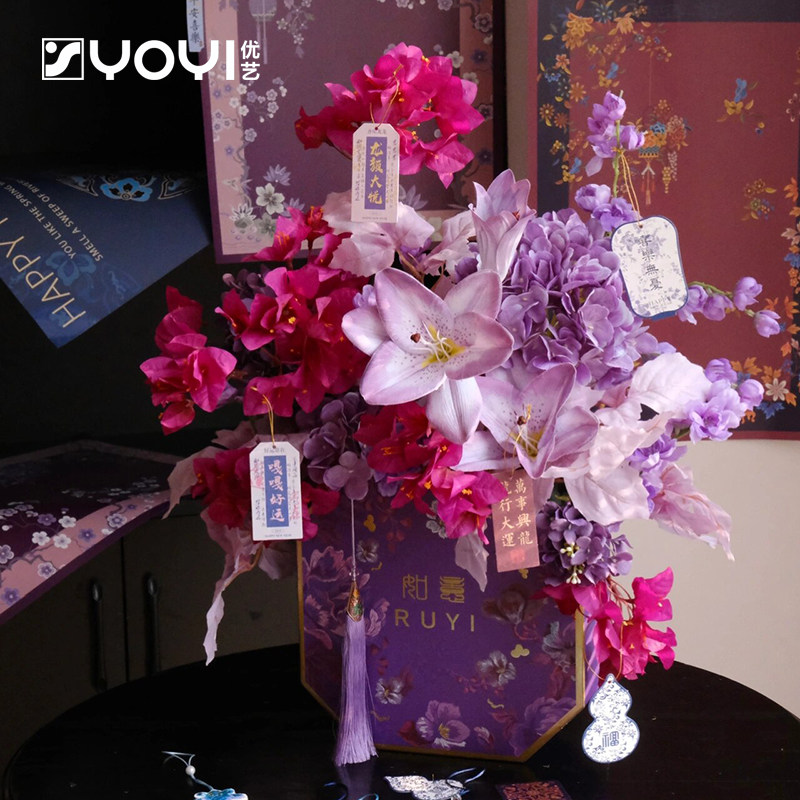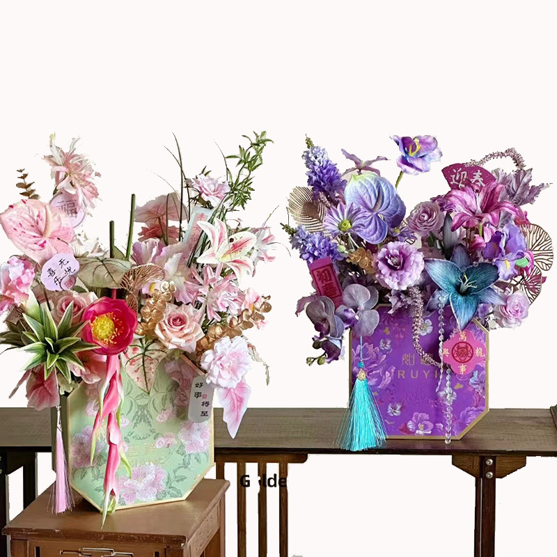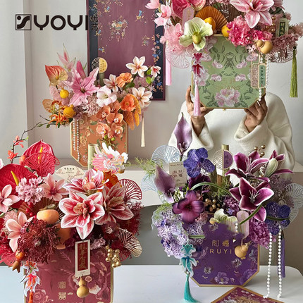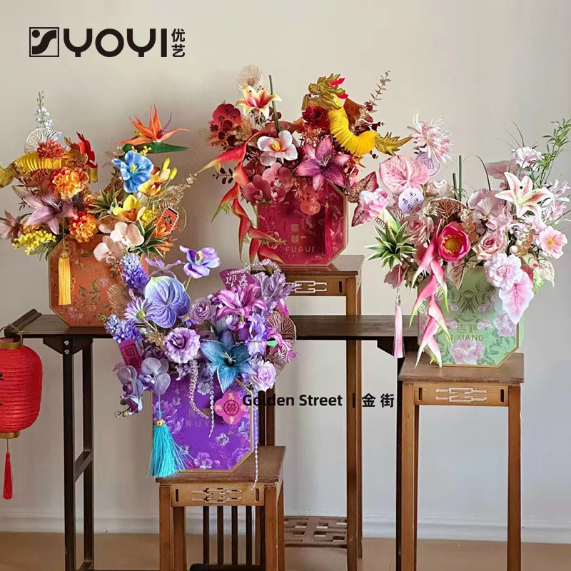 优艺 新中式八角盒年宵花抱抱桶新年福桶花盒国风插花盒礼盒