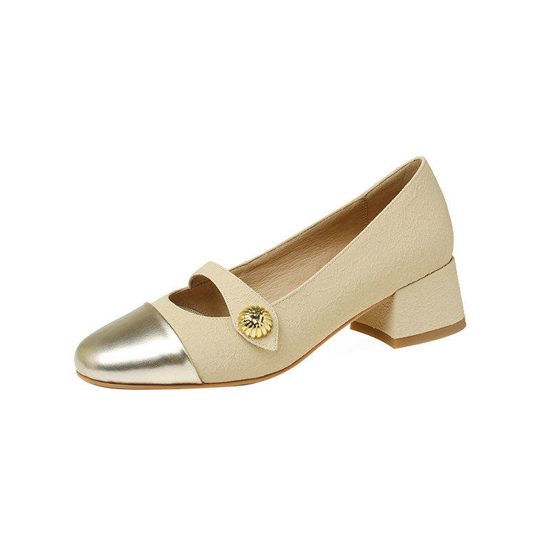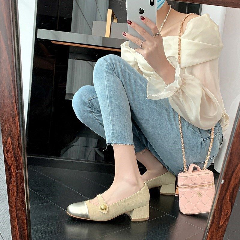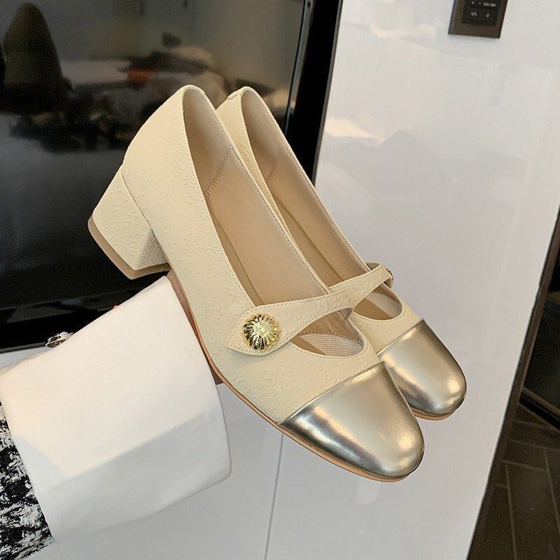 中跟拼色玛丽珍单鞋女2026年新款圆头欧货春秋季粗跟真皮浅口单鞋