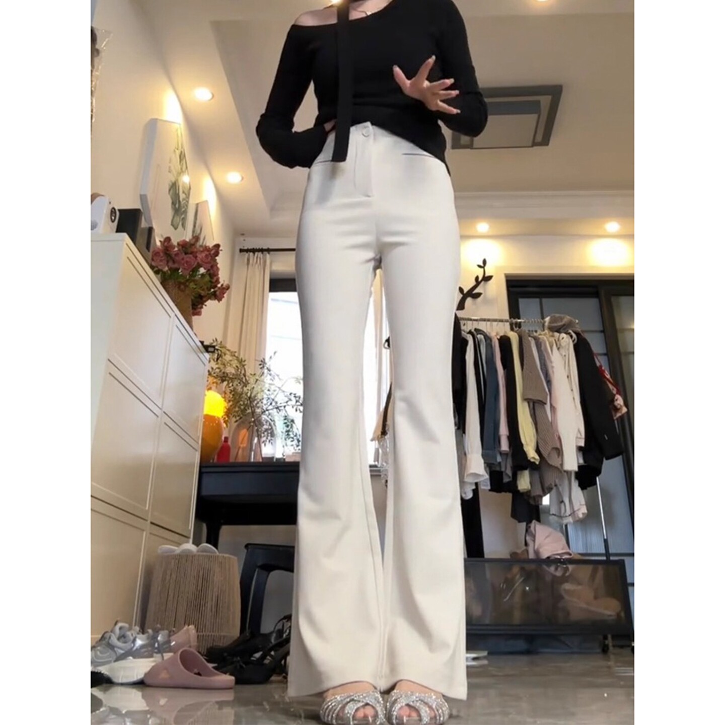 米白色韩版气质加绒微喇西装裤女2026春夏新款高腰弹力修身喇叭裤