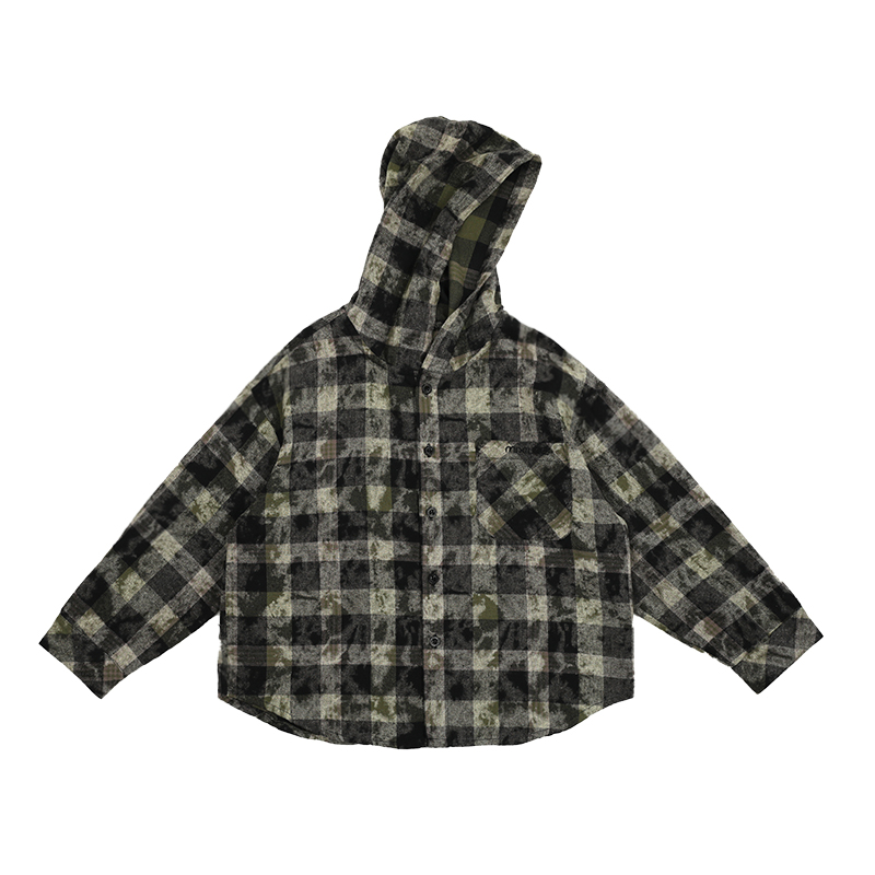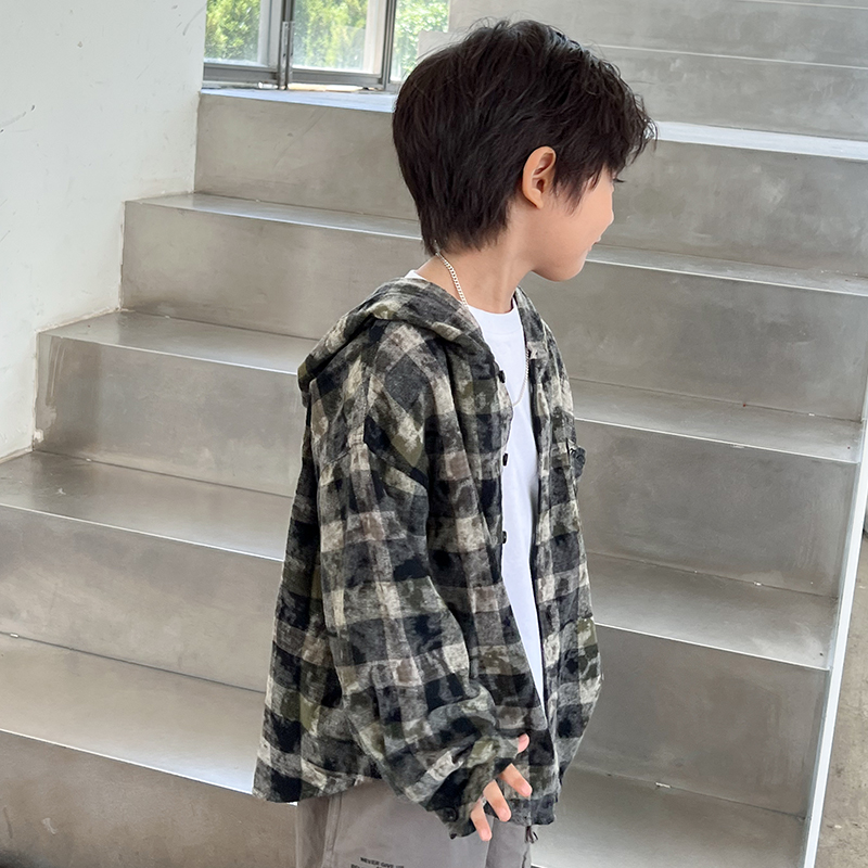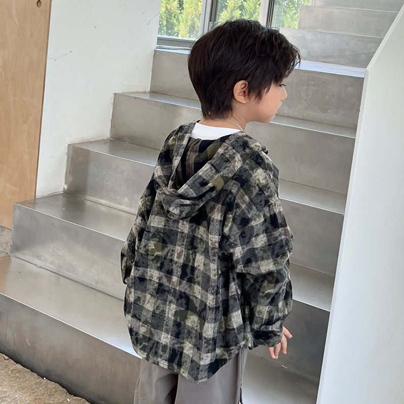 新款秋季连帽男童格子衬衫米修叻