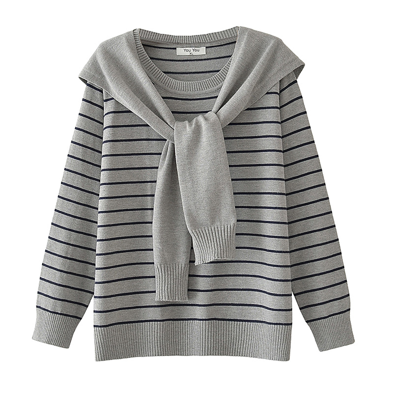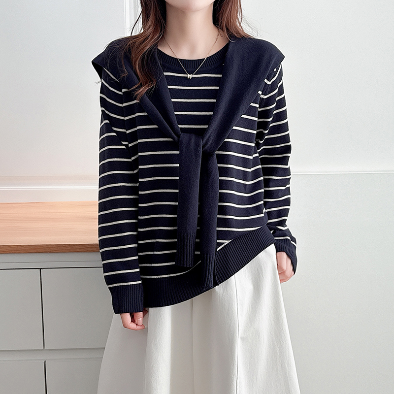 大码条纹毛衣女海军领披肩两件套
