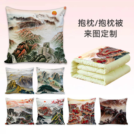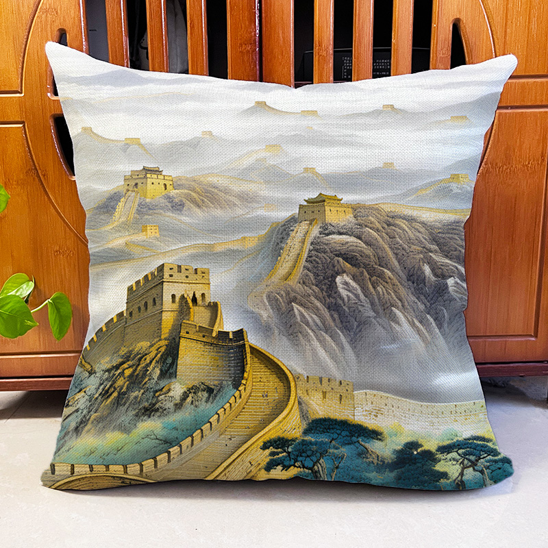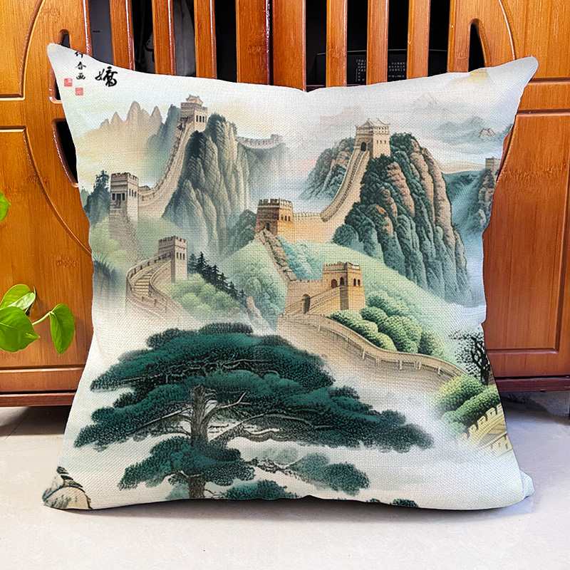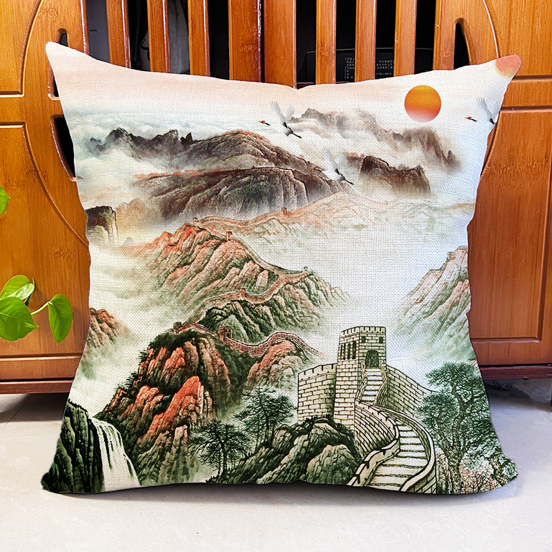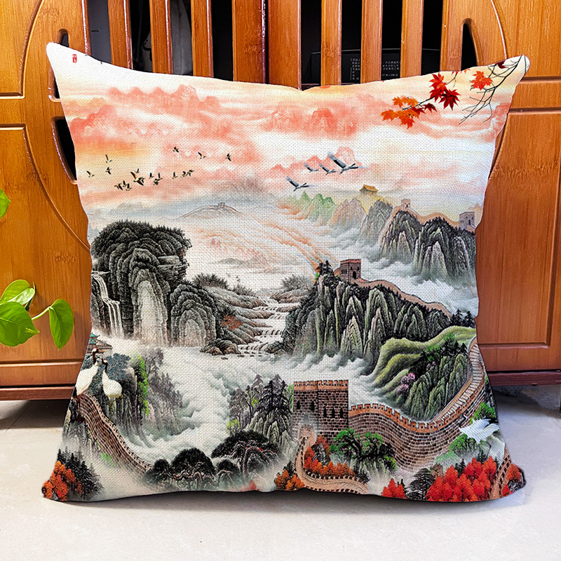 万里长城靠山图棉麻抱枕办公室风水招财沙发靠垫中国风国画靠枕被