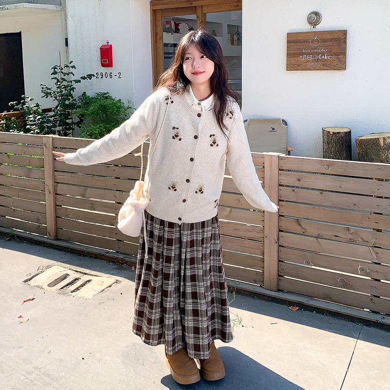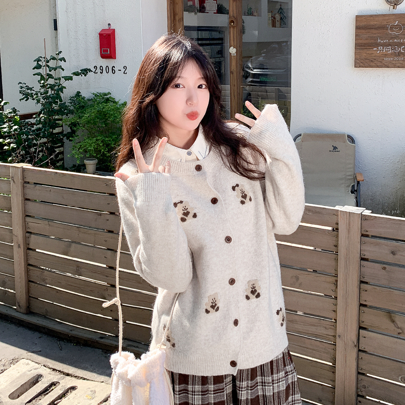 艺野系可爱小熊提花含羊毛米色针织开衫外套女日系学生毛衣2025秋