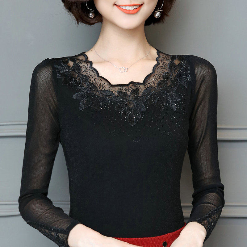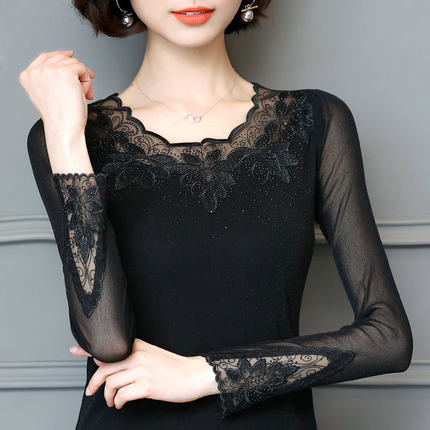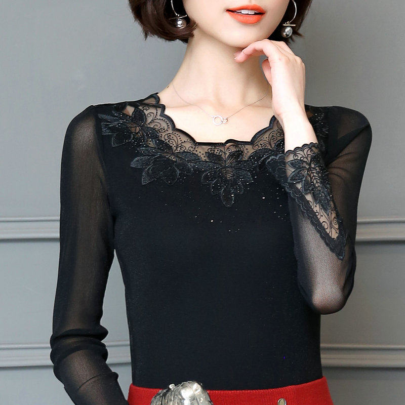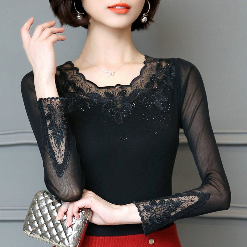 低领网纱打底衫长袖内搭烫钻蕾丝