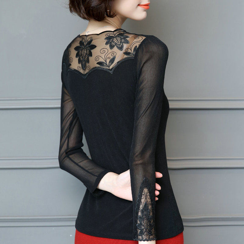 低领网纱打底衫女长袖薄沙衣服内搭上衣洋气t恤外穿蕾丝衫春秋装