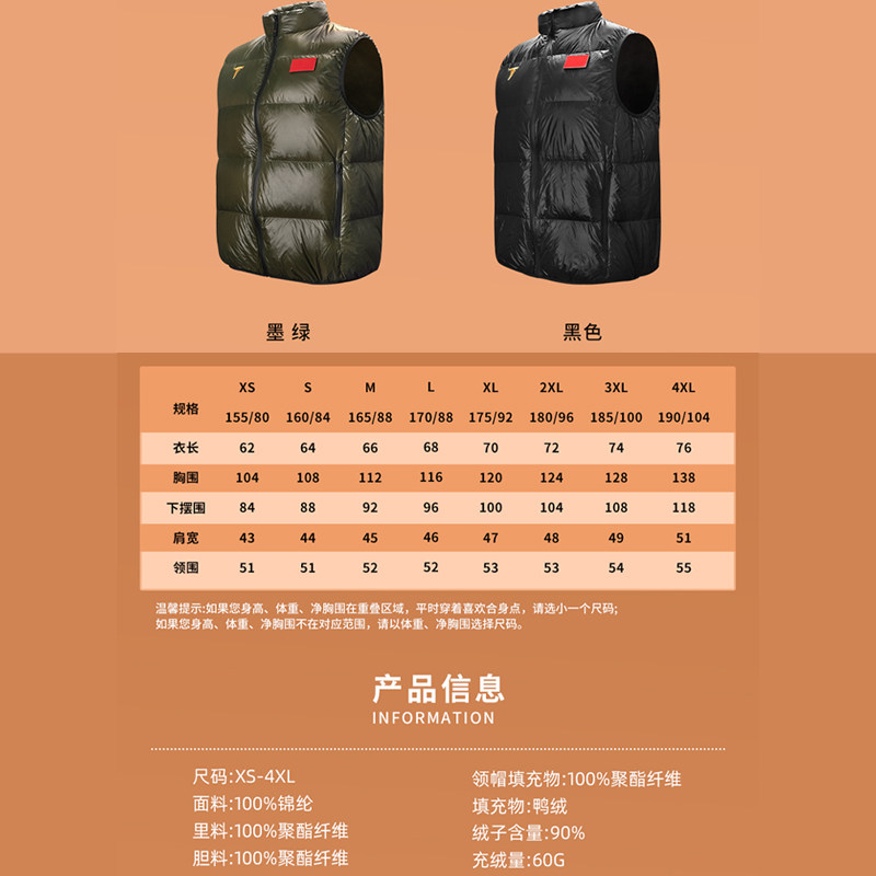 TIBHAR挺拔羽绒马甲乒乓球运动服
