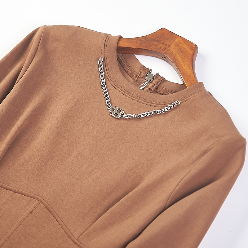 528韩版纯色时装长袖连衣裙女75444春秋圆领项链装饰修身包臀中裙