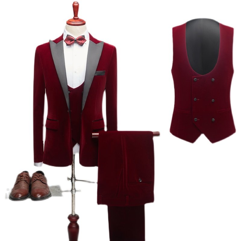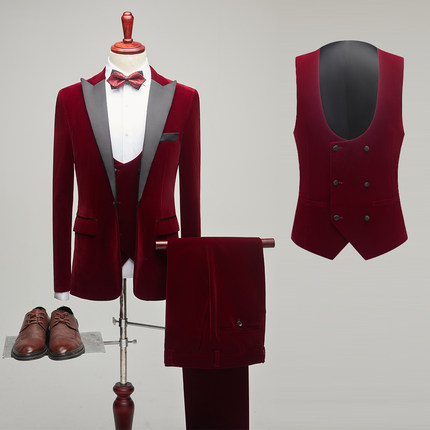 酒红色商务休闲西装男三件套撞色单西主持人礼服秋冬宴会新郎套装