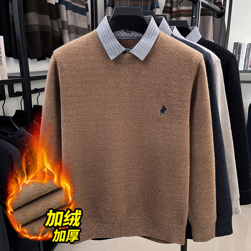 送父亲加绒加厚衬衫领毛衣新款男装中年商务休闲假两件上衣