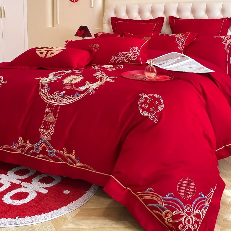中式简约刺绣婚庆四件组大红色床单被套结婚床上用品婚房