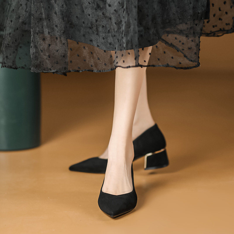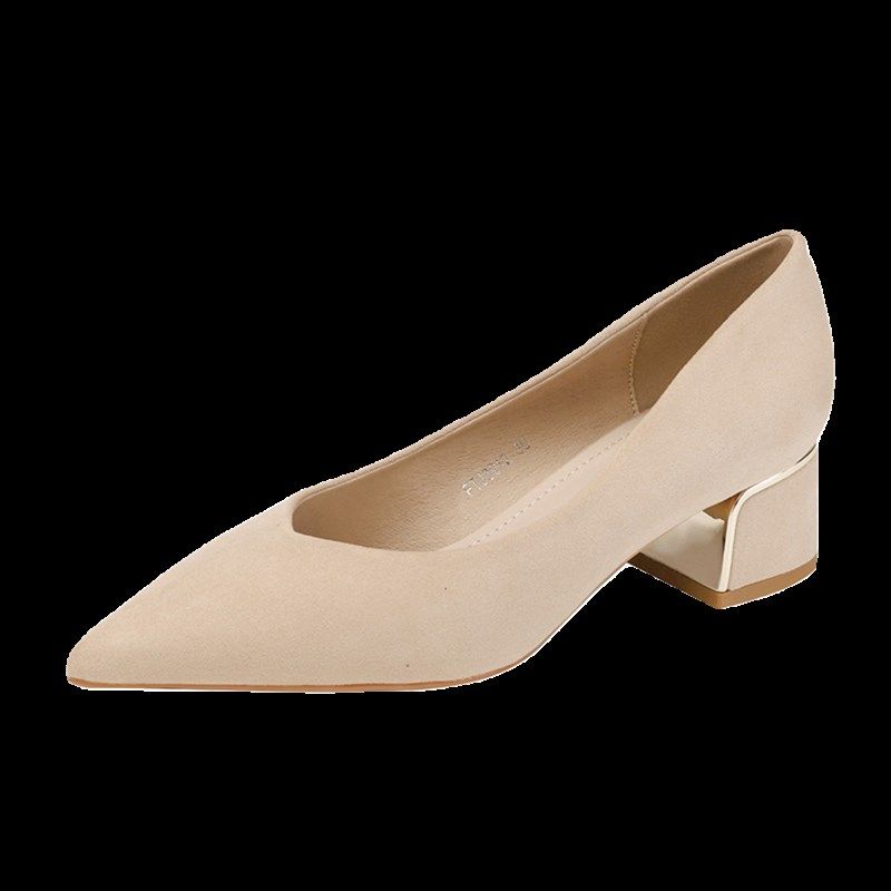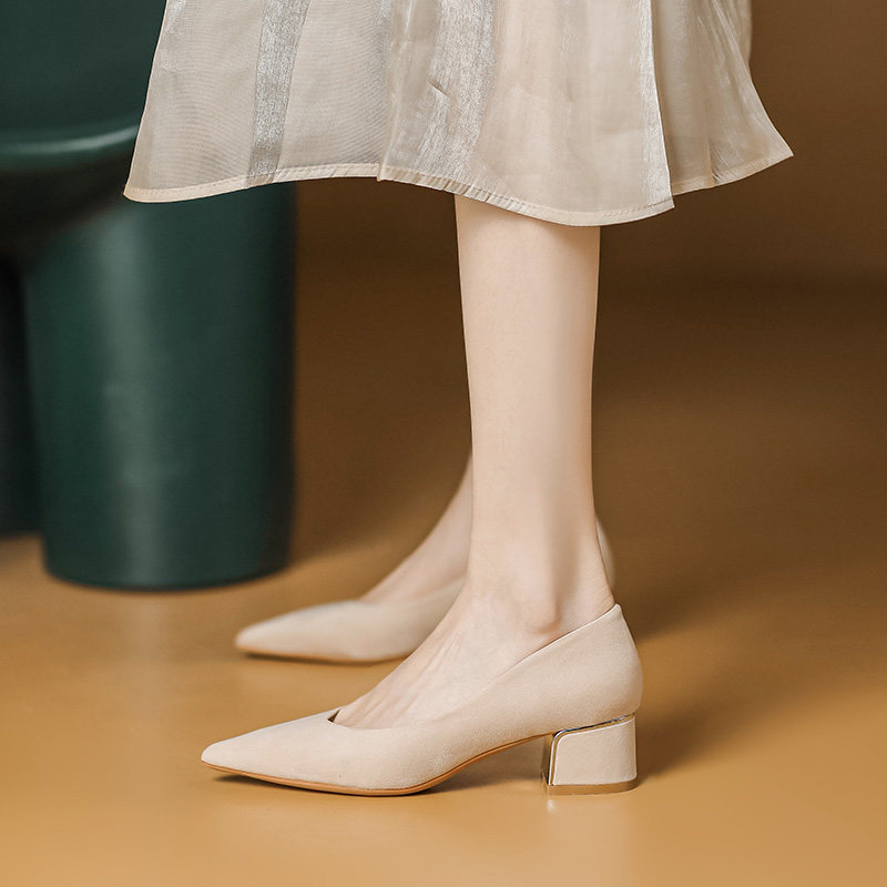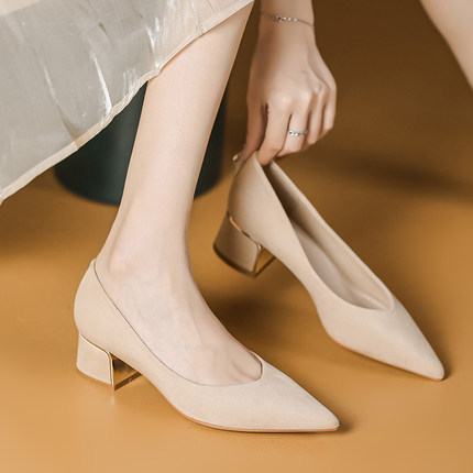 杏色高跟鞋女粗跟春法式时尚浅口尖头通勤绒面不累脚中跟工作单鞋