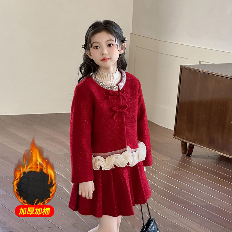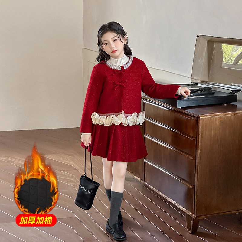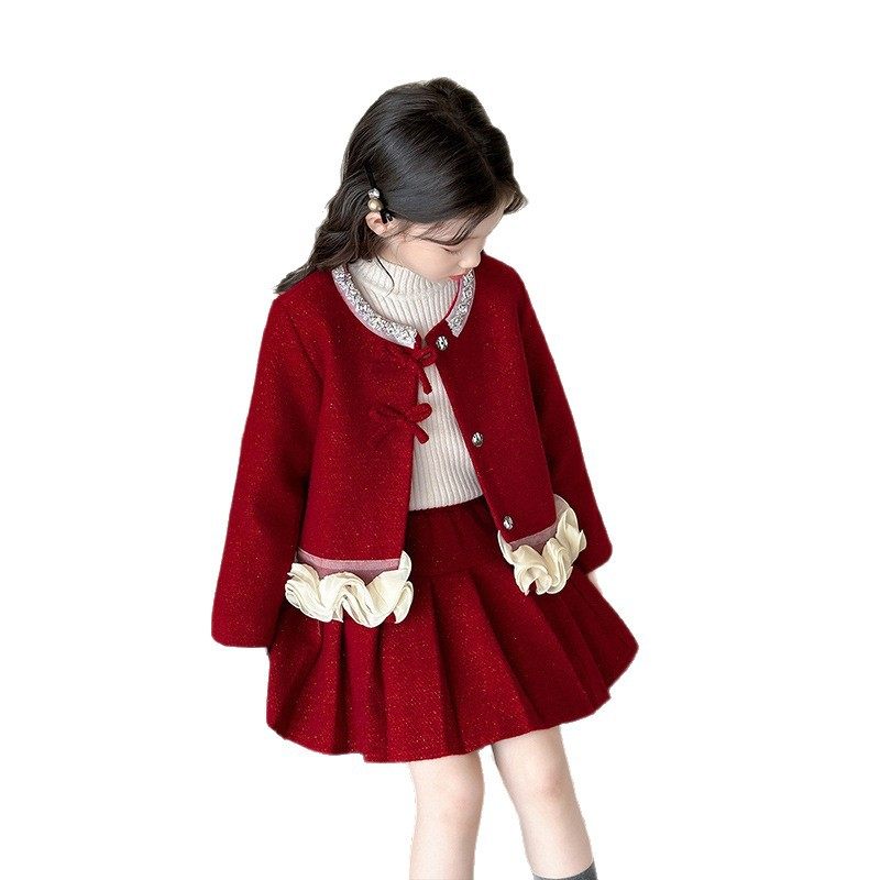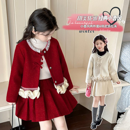 女童轻奢秋冬款红色小香风套装裙重工高级感短外套气质名媛两件套