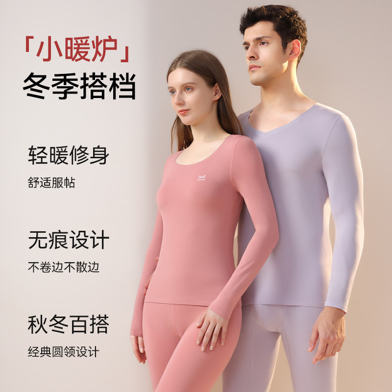猫人莫代尔保暖内衣女士上衣薄款打底内搭无痕圆领秋衣秋裤套装女