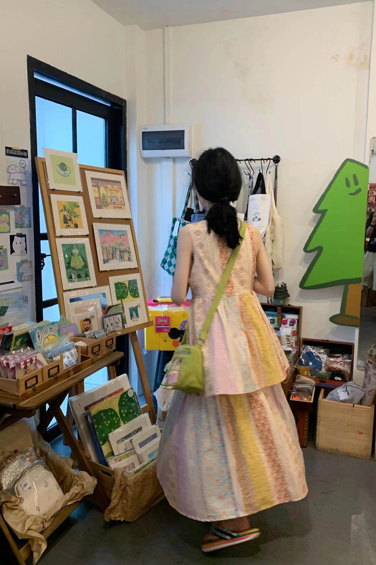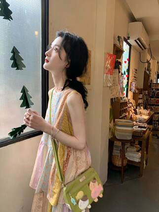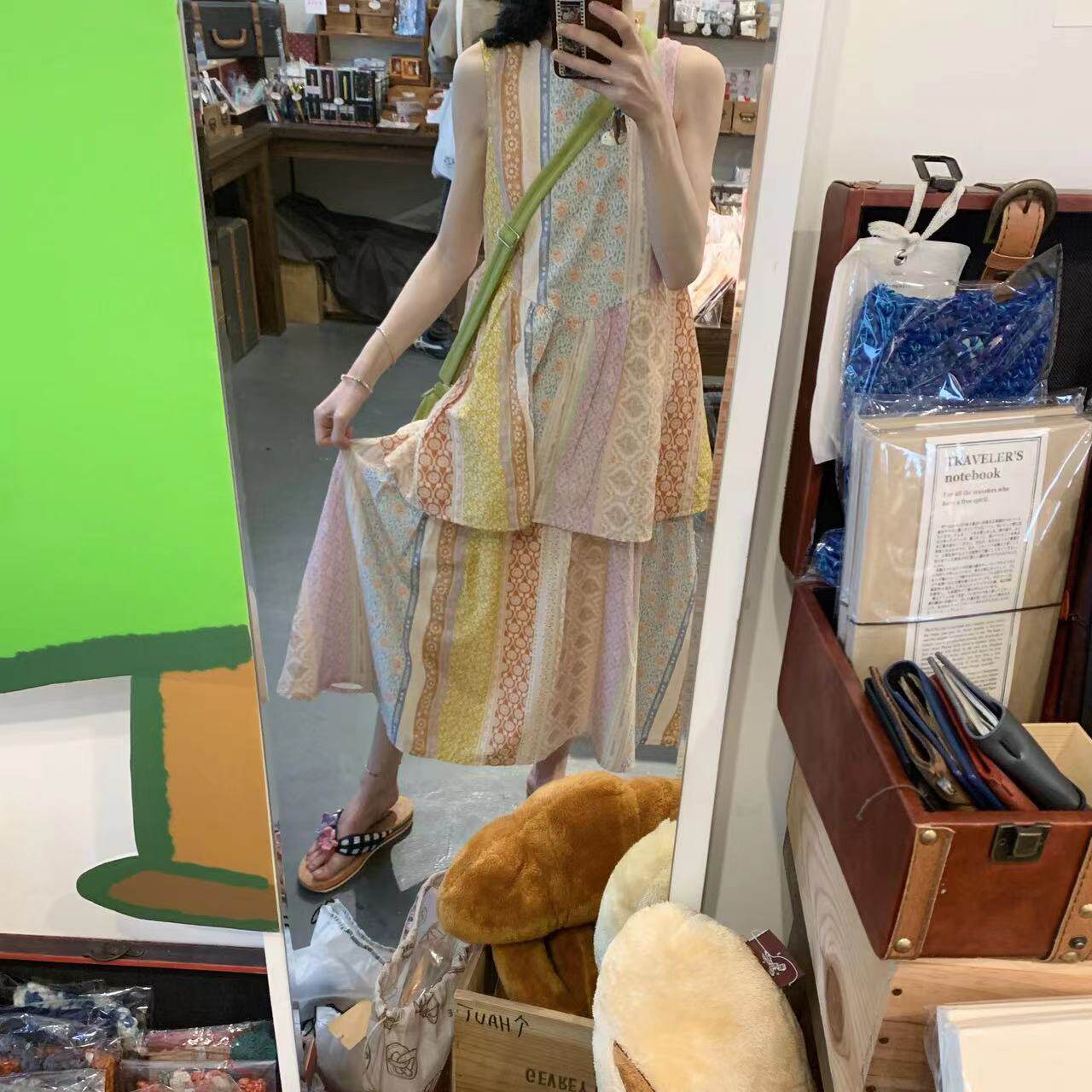 4video自制 民族风碎花拼接柔美纯棉背心马甲吊带 森女连衣裙