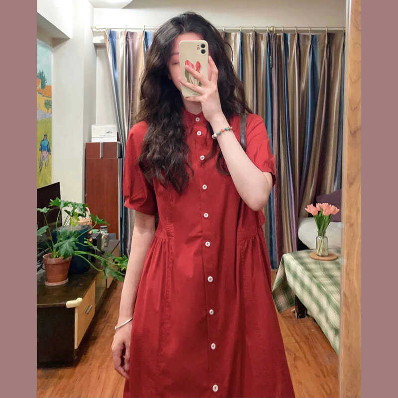 文艺复古红色衬衫连衣裙女夏新款短袖宽松休闲显瘦日系小个子长裙