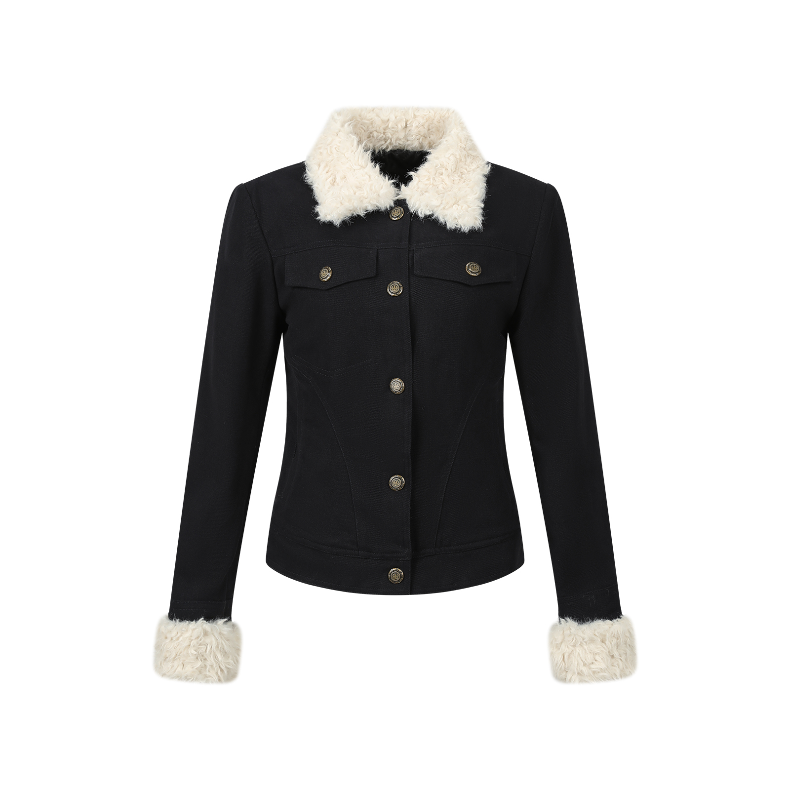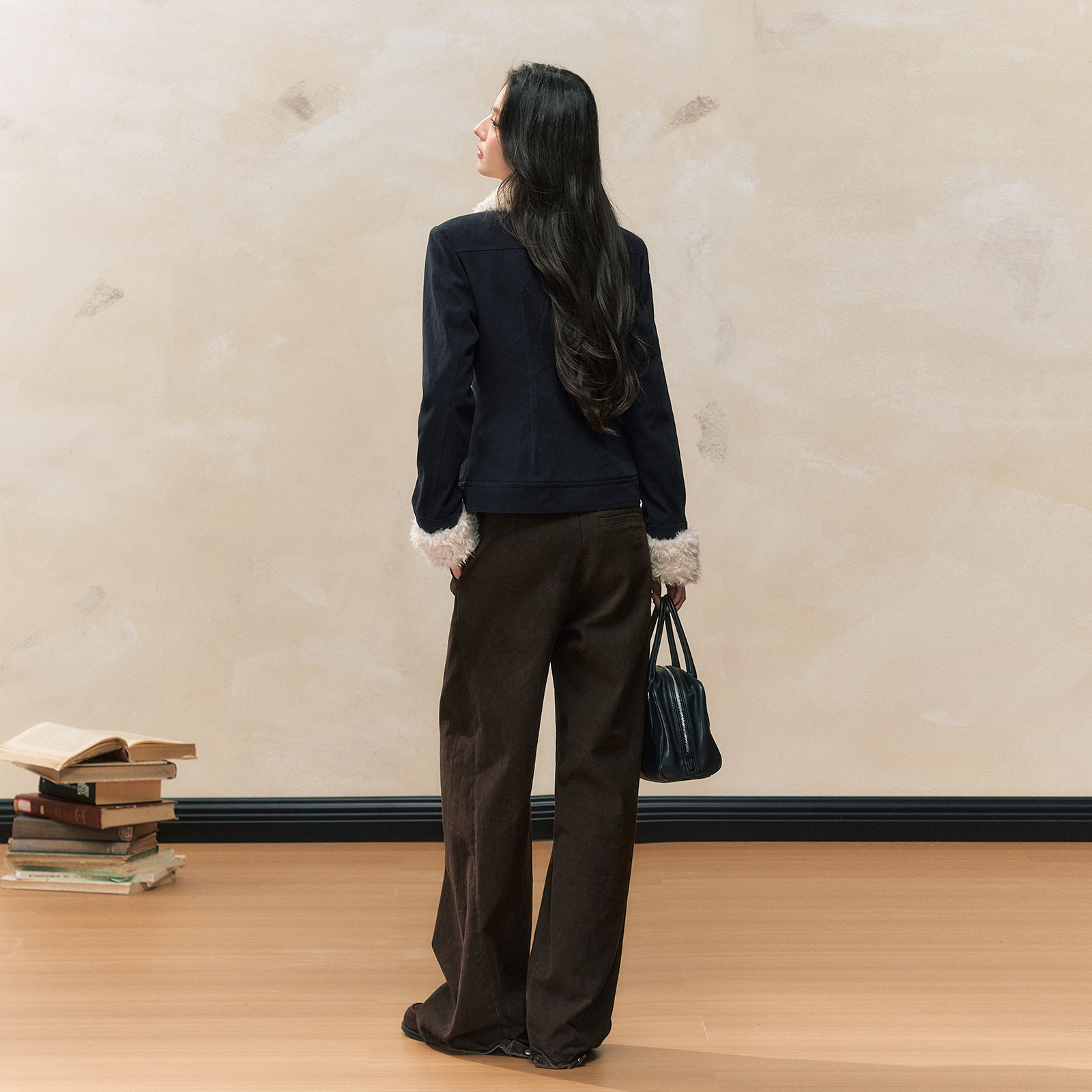 7Shiftin 原创设计秋冬新款修身藏蓝色短款外衣夹棉毛领外套女
