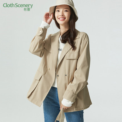 布景风衣女中长款春季新品工装风西装领大口袋宽松长袖外套0254
