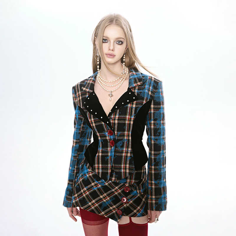 DIET GRRRL 2024SSS春夏新品原创蓝色格子纹呢西装套装