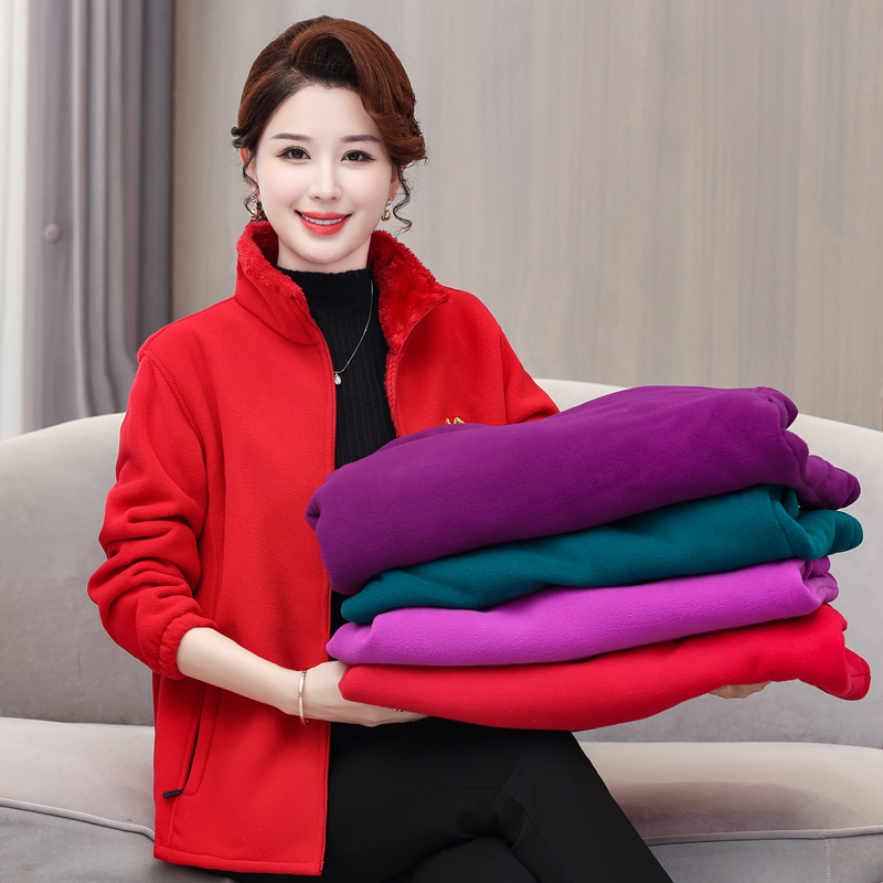 中老年女装秋冬加绒加厚珊瑚绒上衣外套开衫卫衣大码抓绒衣妈妈装