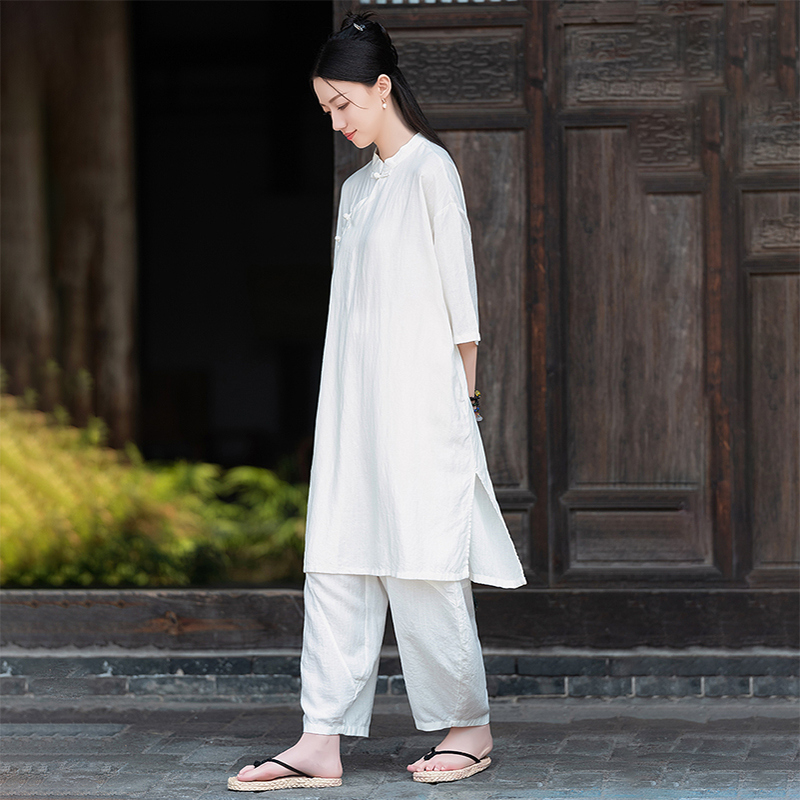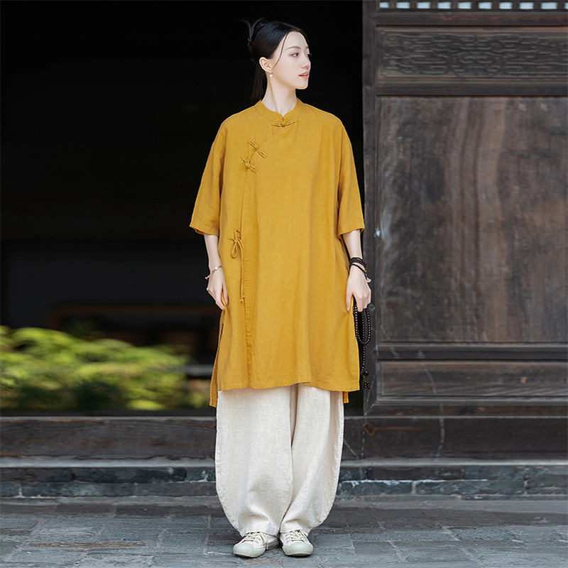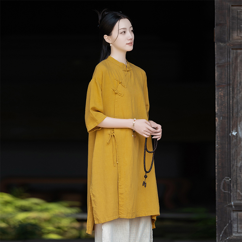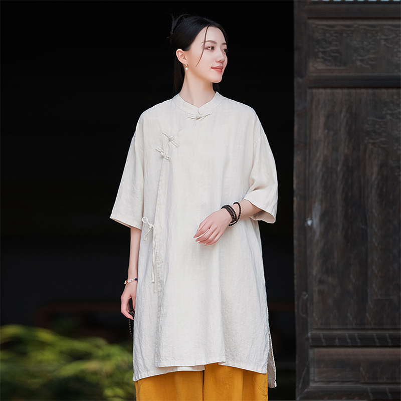 亚麻复古新中式短袖衬衫女春秋2025新款棉麻国风偏襟袍子禅修茶服