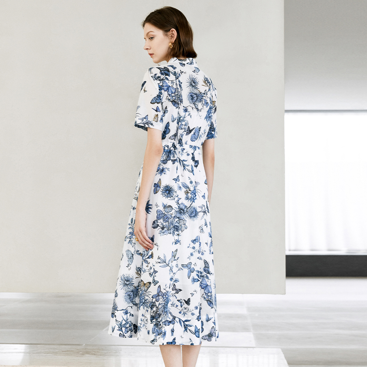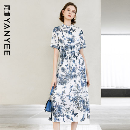 颜域短袖立领连衣裙2025新款女夏季收腰显瘦中长款蓝色印花裙子女