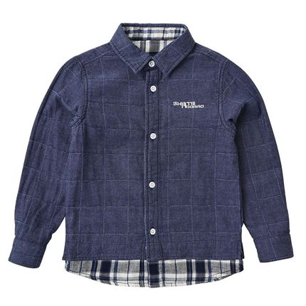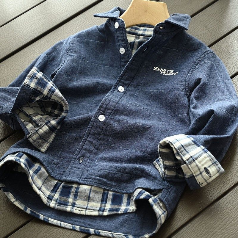 75559 儿童纯棉双层长袖衬衣 男童女童仿牛仔格子衬衫中大童上衣