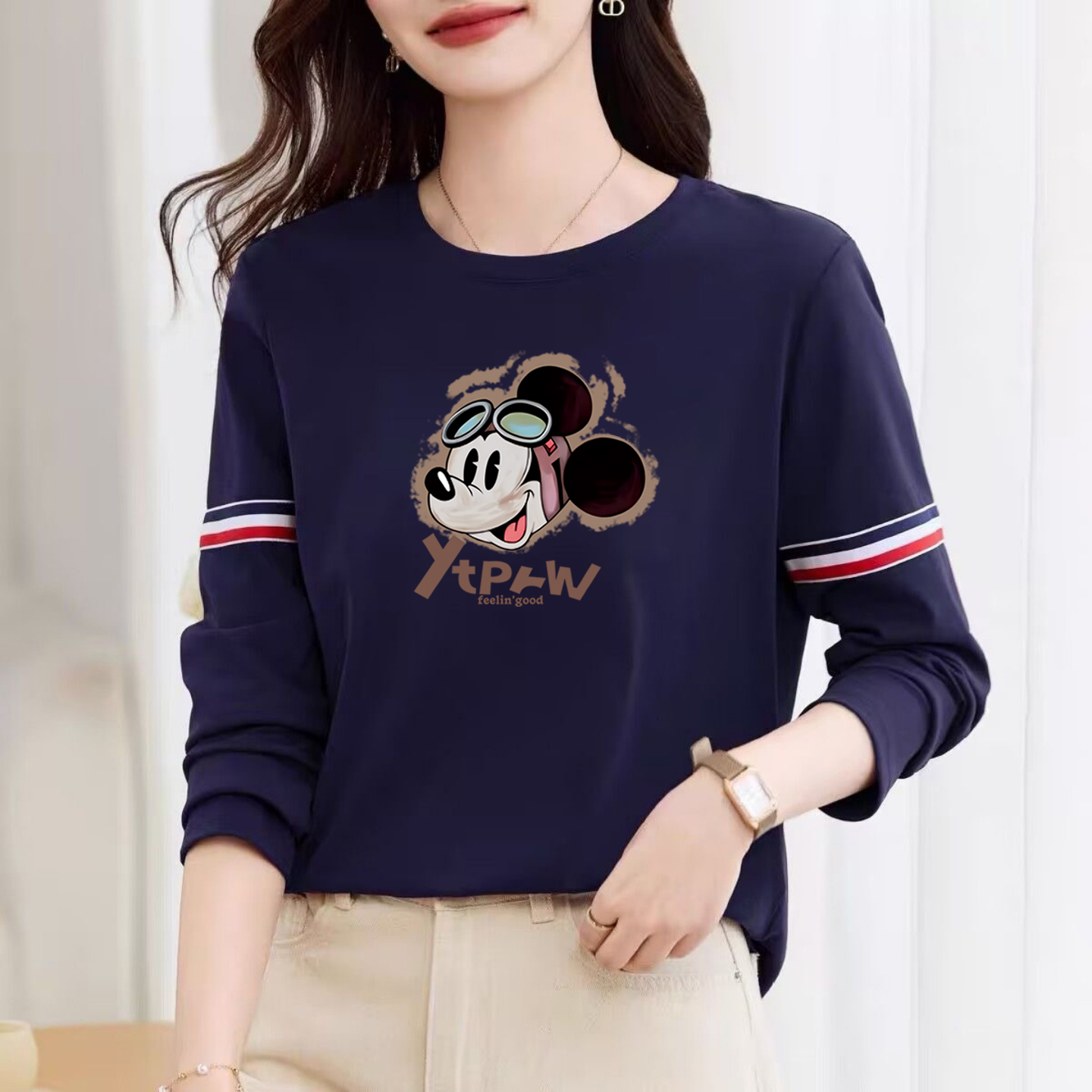 外贸原单女装纯棉长袖T恤女早秋洋气打底衫时尚印花圆领套头上衣