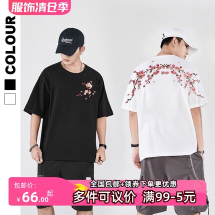 2024夏季新款国潮中国风潮牌宽松梅花刺绣短袖t恤情侣装半袖男式