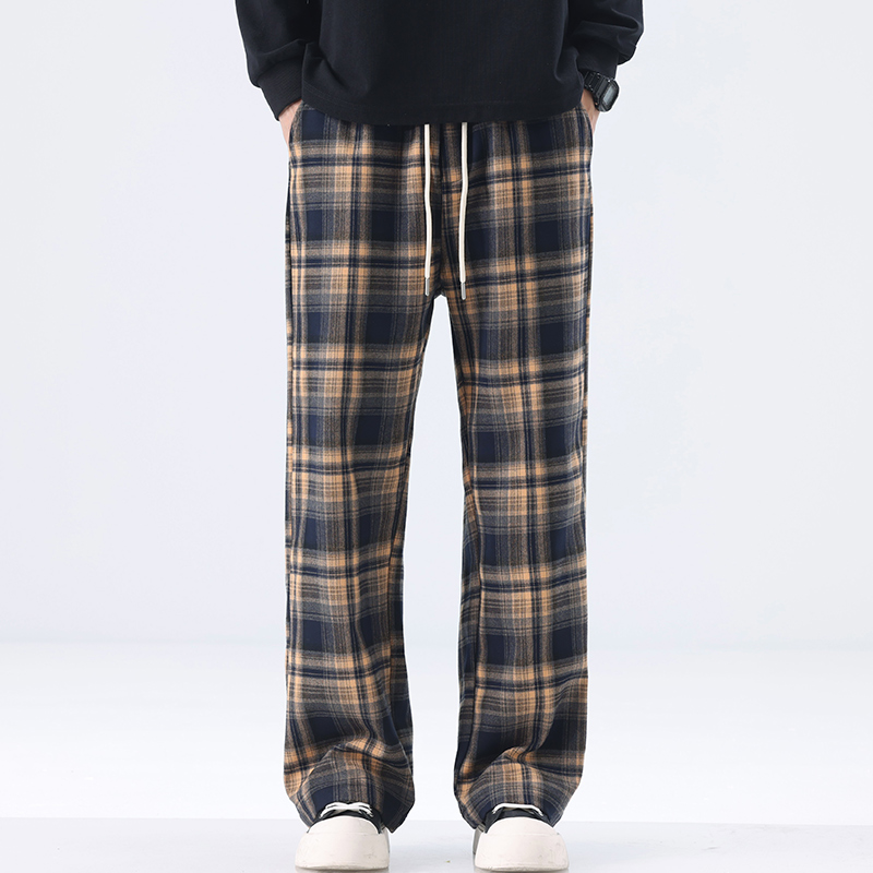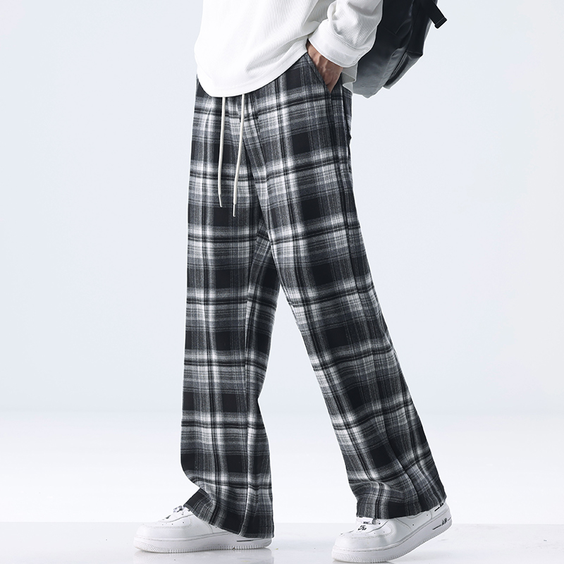 春秋松紧腰格子阔腿休闲裤男青少年男生学生加肥加大码宽松直筒裤