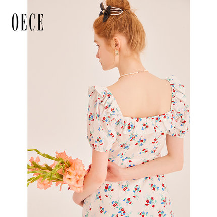 Oece法式甜美小碎花裙子女夏季新款女装复古大方领连衣裙长裙