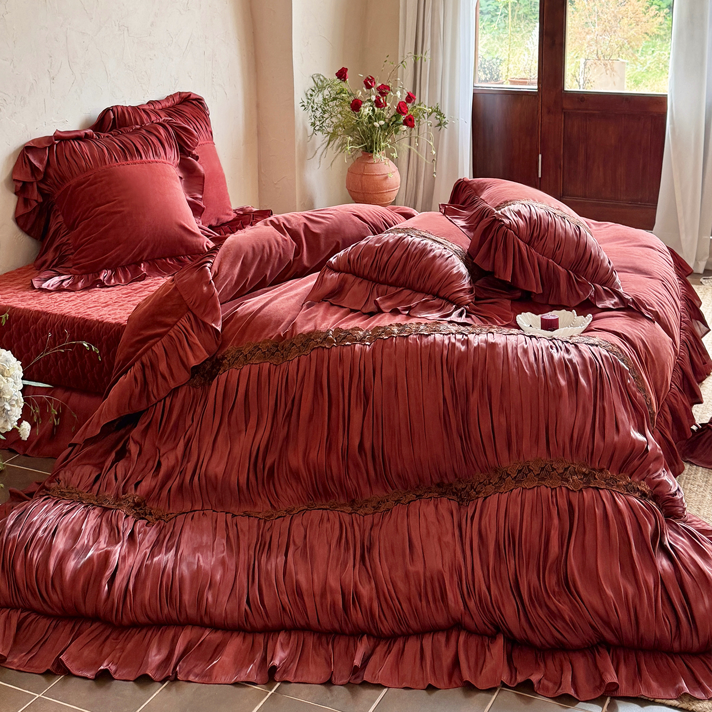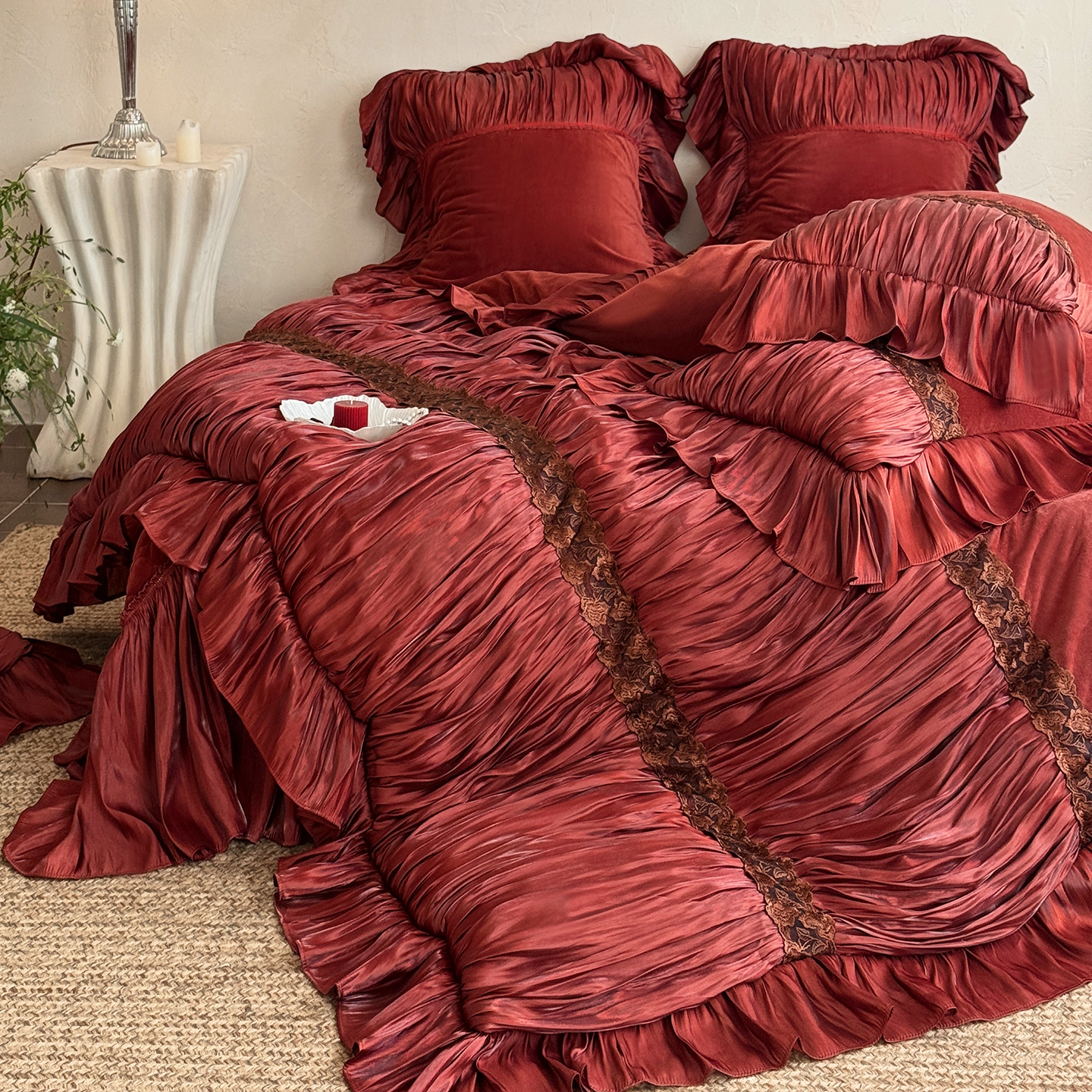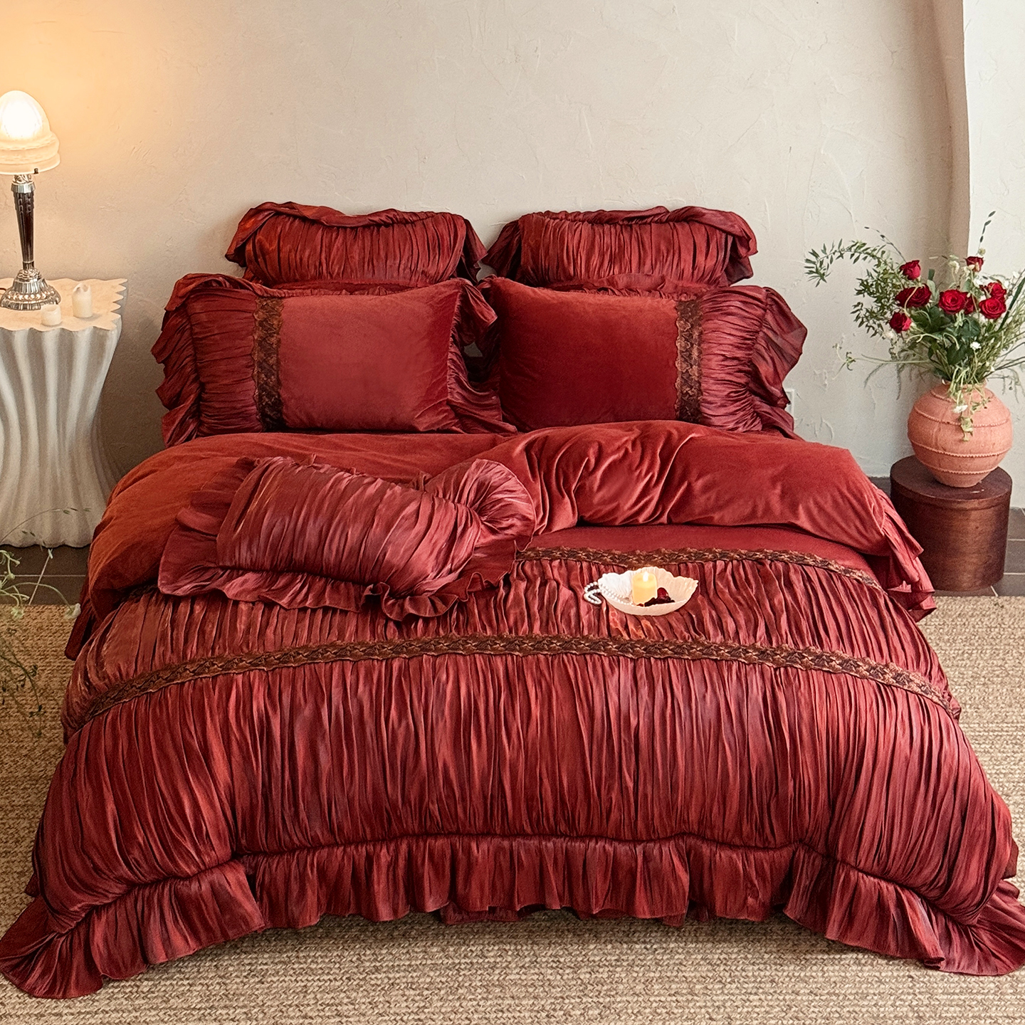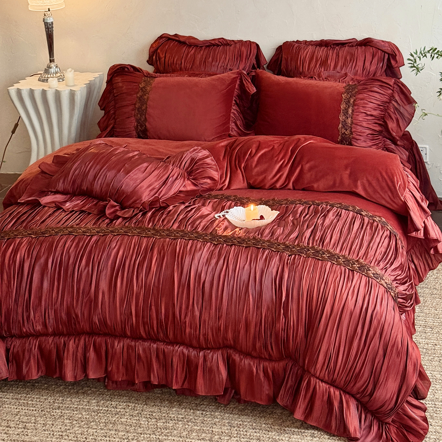 酒红色婴儿绒荷叶边婚庆床品四件套浪漫复古风被套床单牛奶绒床品
