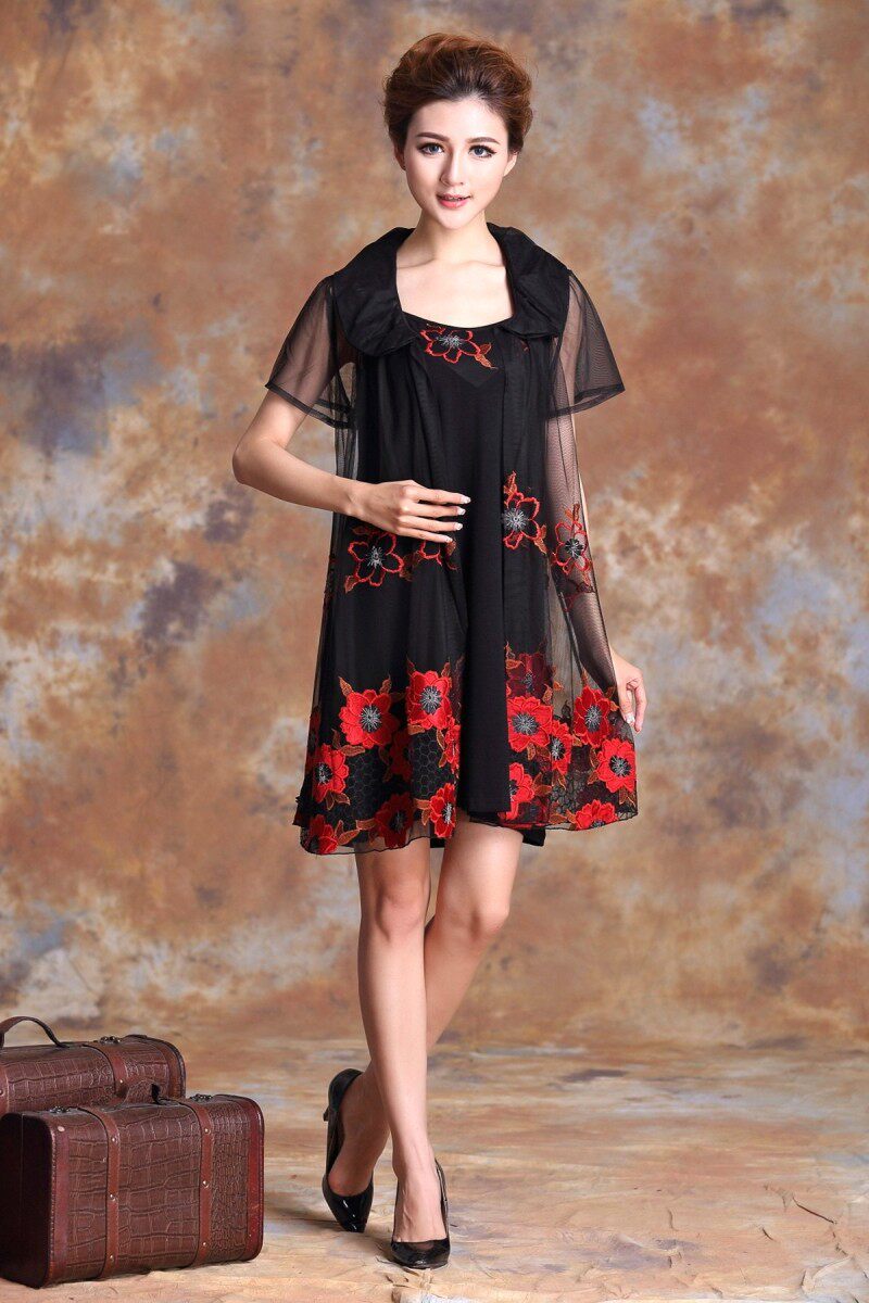 天慈2016夏季新款网纱刺绣宽松连衣裙大码女装胖mm雪纺蕾丝裙